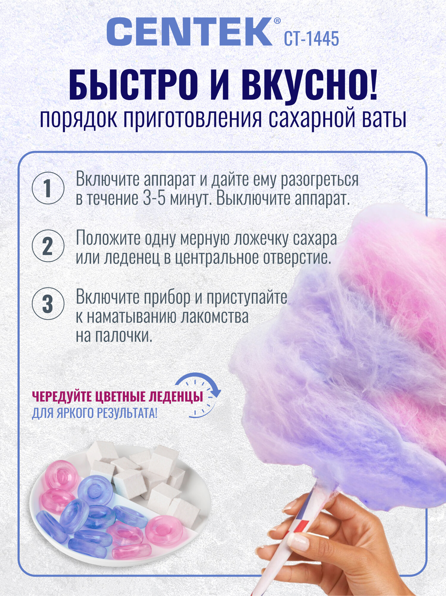 Приобретая аппарат для сахарной ваты Centek CT-1445, вы инвестируете в источник радости и удовольствия, который не раз порадует вас и ваших близких. Не упустите возможность насладиться лучшими моментами с домашней сладкой ватой и создать свои уникальные десерты. С этой машинкой для ваты все ваши кулинарные фантазии станут реальностью, а атмосферу волшебства и радости гарантировано добавит каждый сладкий недочет, создаваемый вами.