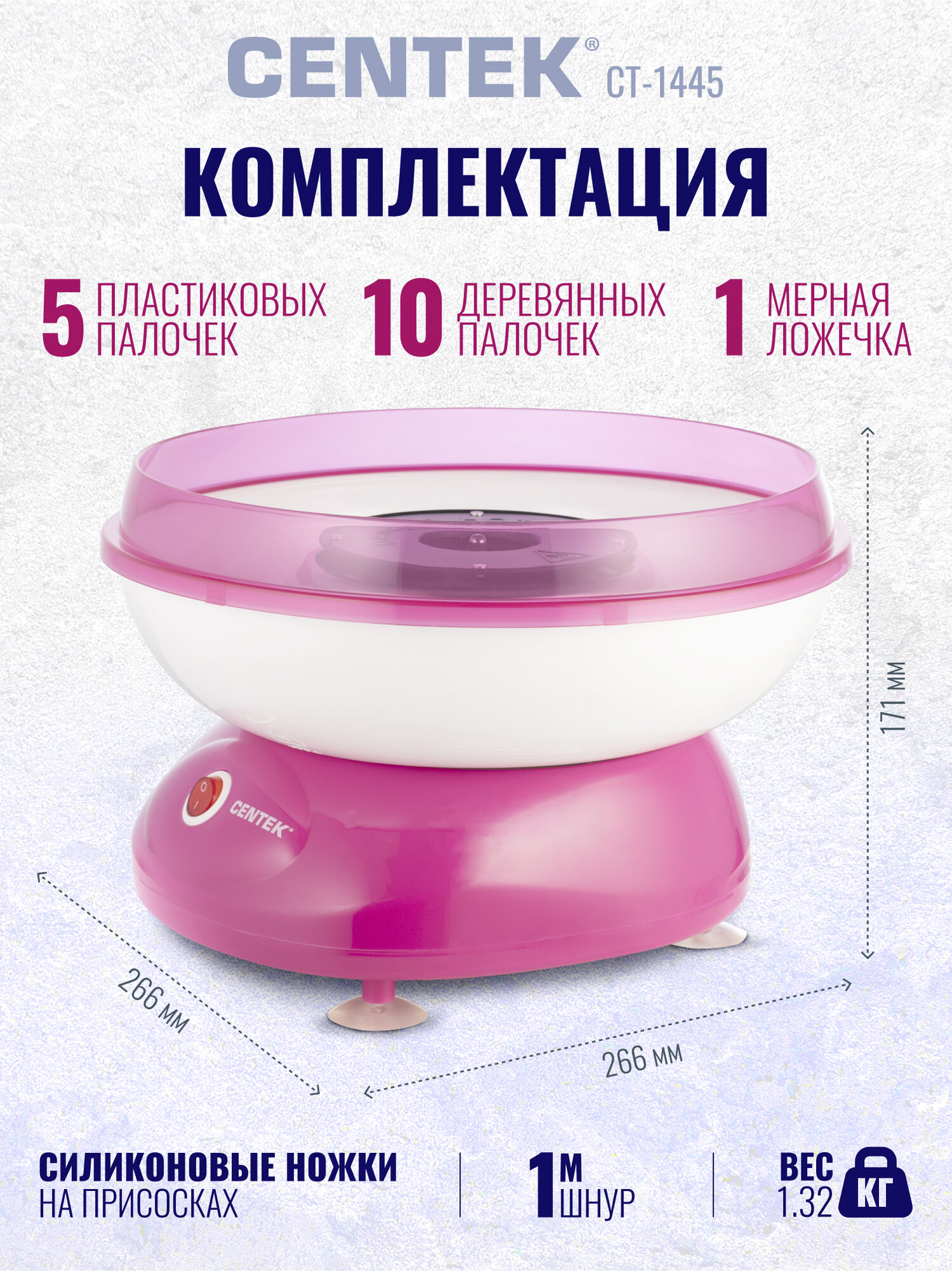Создайте атмосферу настоящей праздности с аппаратом для сахарной ваты Centek CT-1445. Эта замечательная машинка для приготовления сладкой ваты станет отличным дополнением к любому празднику или семейному вечеру, позволяя вам наслаждаться любимым десертом, не выходя из дома.