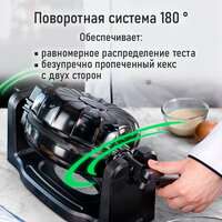 Мощность 1500 Вт обеспечивает быстрый и равномерный прогрев рабочей поверхности. Это позволяет получить аппетитные и пышные кексы всего за несколько минут.
