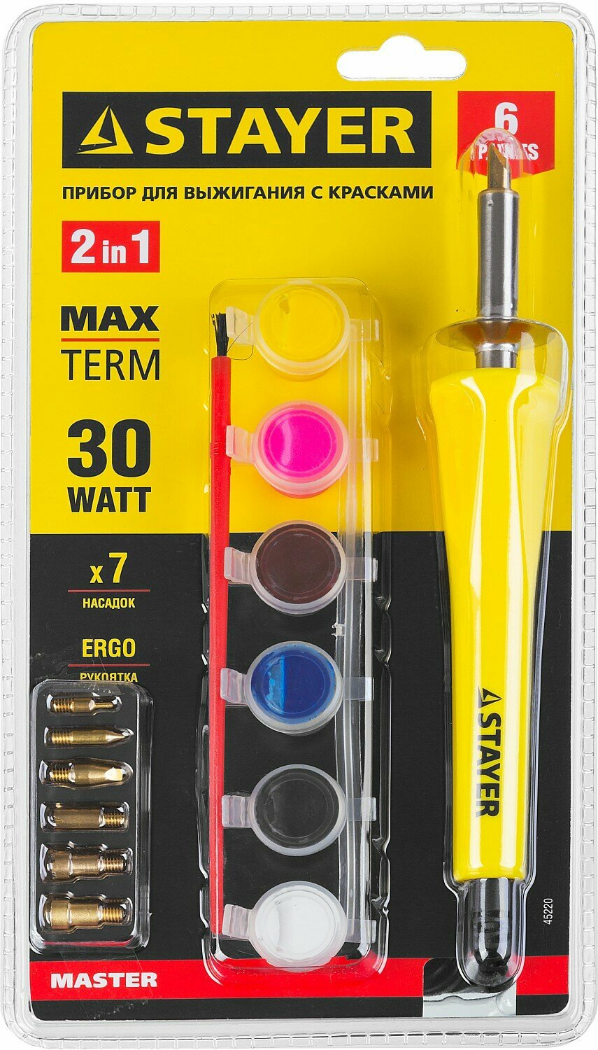 Купить STAYER MAXTerm, 30 Вт, 2 в1, в наборе: 7 насадок + краски, прибор для выжигания и пайки (45220) с доставкой по всей России.