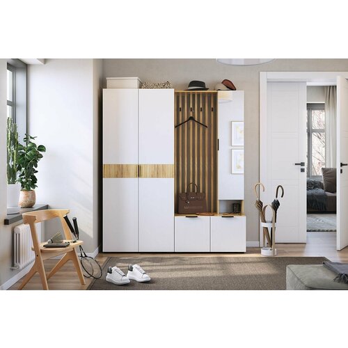 В комплект входят различные элементы, которые обеспечивают максимальную функциональность. Вы найдете удобные полки для верхней одежды, а также специальное место для обуви. Это позволяет поддерживать порядок и чистоту в прихожей, а ваши вещи будут в безопасности. Эстетика комплекту придаёт качественное покрытие, которое обеспечивает долговечность и легкость в уходе.