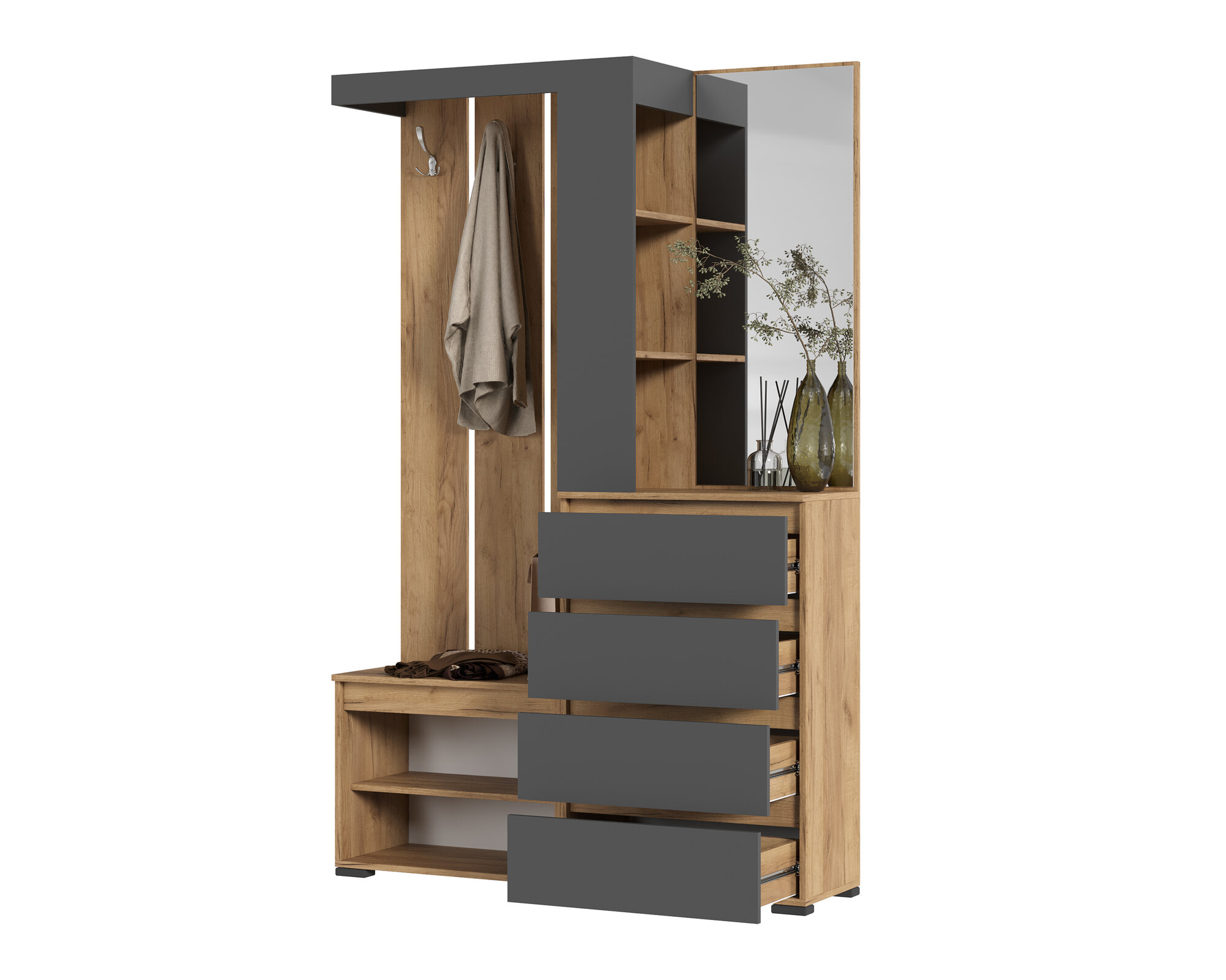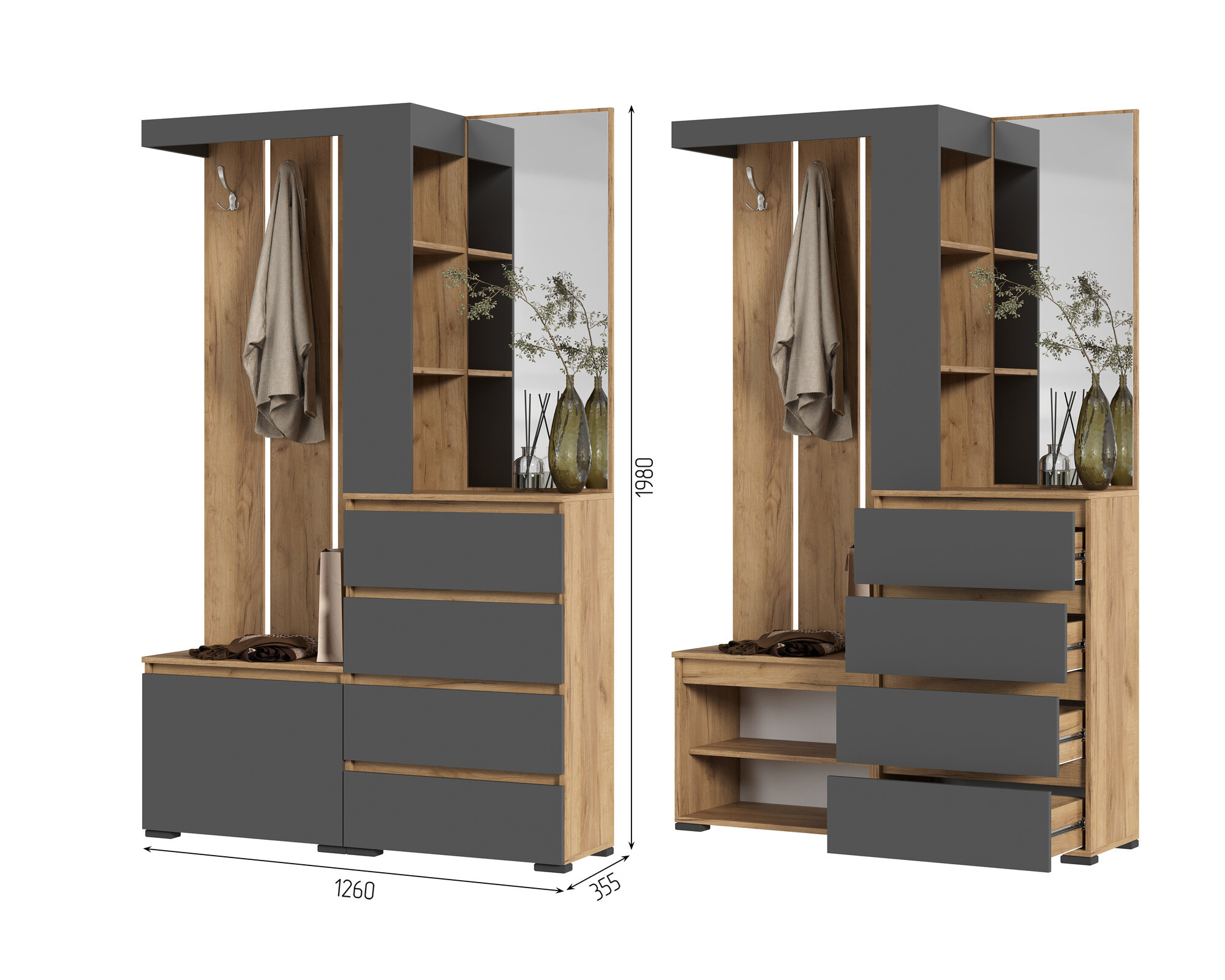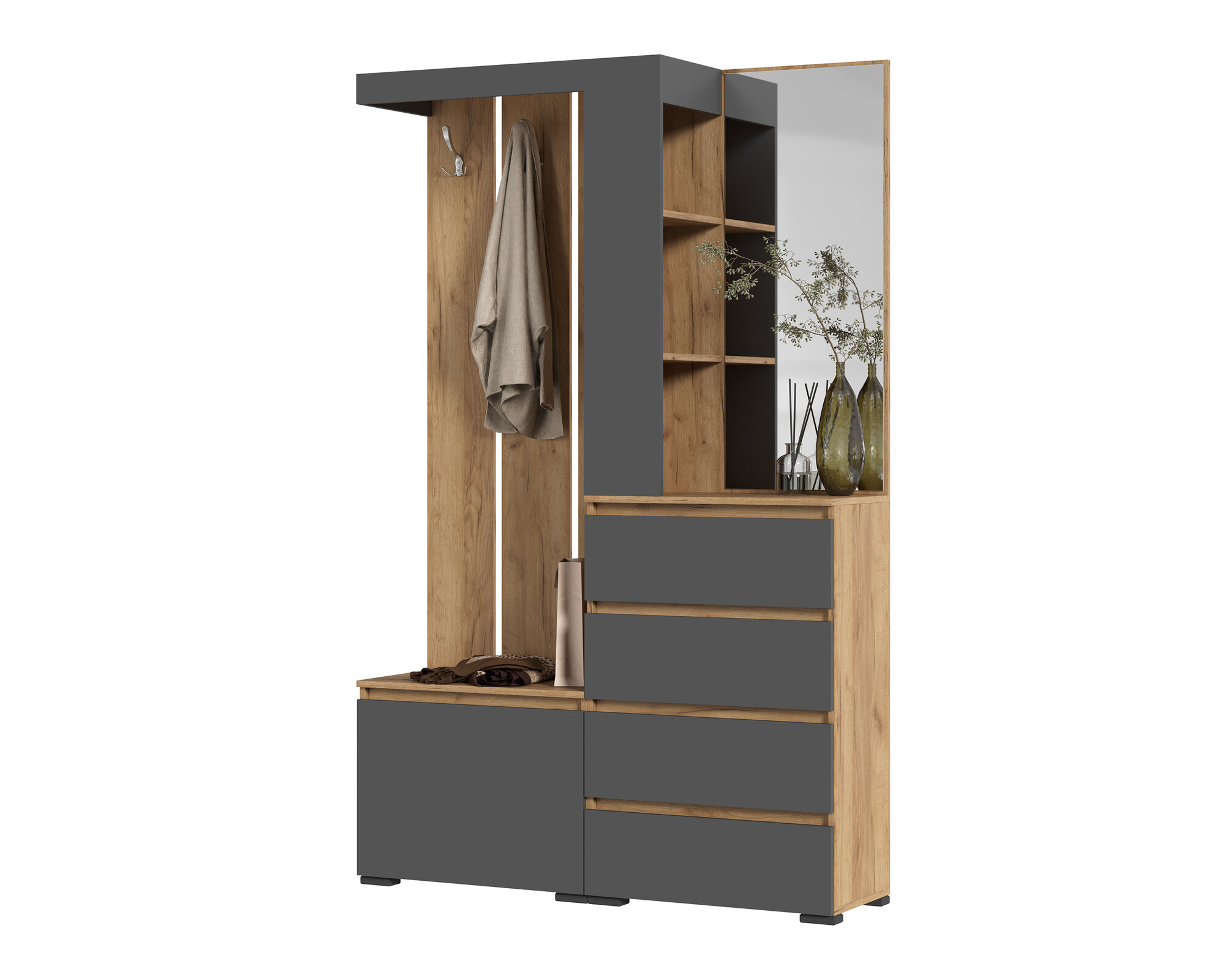 для маленькой прихожей, для узкой прихожей, крепление к стене, модульная конструкция, с местом для сидения, со штангой для вешалок, шкаф без зеркала, шкаф с зеркалом