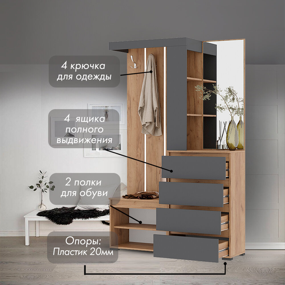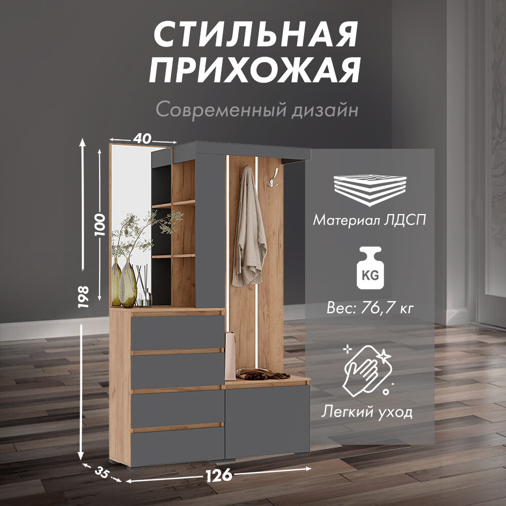 Прихожая с зеркалом и обувницей выполнена в цвете серый графит дуб крафт золото, что придает ей изысканный и современный вид. Корпус и фасад изготовлены из качественного ЛДСП, что обеспечивает долговечность и устойчивость к повреждениям.