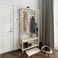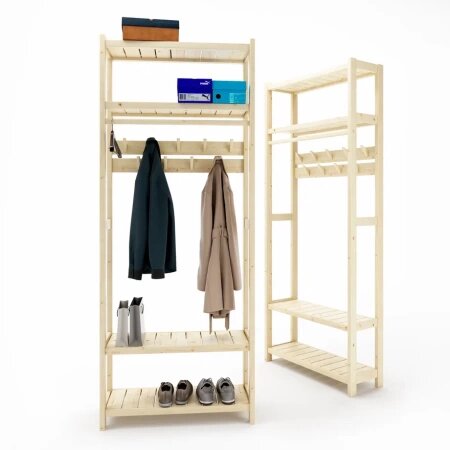 - Полки для обуви и антресоль - 4шт - Крючки для одежды - 9шт в 2 ряда - Перекладина для плечиков - 85см - Расстояние между верхними и нижними полками 32см - Расстояние между верхним рядом крючков и второй полкой - 125см - При необходимости вешать длинную одежду (например плащ) вторую полку можно не устанавливать - Полки собраны из широких реек с зазором 5мм