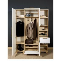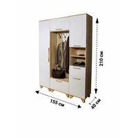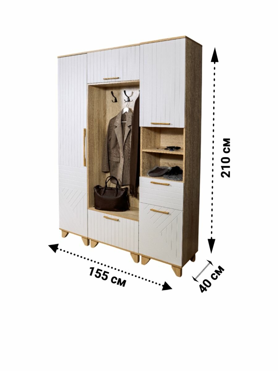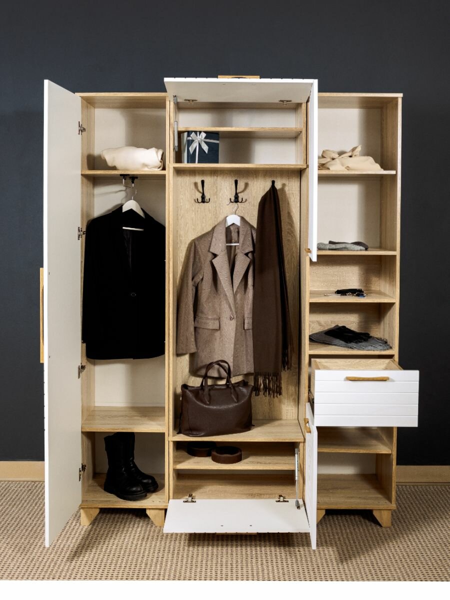 Каждый элемент прихожей можно приобрести отдельно, а также возможны различные варианты комбинирования элементов прихожей: 1. Пенал правосторонний артикул 51581850540 2. Пенал левосторонний артикул 51581850545 3. Вешалка с тумбой артикул 51581850538 4. Пенал с нишей артикул 51581850541 5. Пенал для одежды + пенал с нишей артикул 51581850537 6. Пенал лев + вешалка с тумбой + пенал прав артикул 51581850542 7. Вешалка + пенал артикул 51581850539 8. Вешалка + пенал с нишей артикул 51581850544 Фото комплектов представлены в данной карточке. Доступны в 12 цветовых сочетаниях. Для получения подробной информации можно оставить вопрос к товару. Прихожая Копенгаген представляет собой комплект мебели, состоящий из пенала для одежды, вешалки с тумбой и пенала с нишей. Этот набор мебели предназначен для использования в прихожей, гардеробе, офисе, коридоре, холле и других помещениях. Мебель выполнена в скандинавском стиле и сочетает в себе функциональность и эстетику. Особенности прихожей: - Регулируемые ножки из массива сосны обеспечивают устойчивость и возможность регулировки высоты в зависимости от пола. - Пеналы оснащены петлями с доводчиками, что обеспечивает плавное и бесшумное закрывание. - Ручки изготовлены из массива дуба, что обеспечивает их долговечность