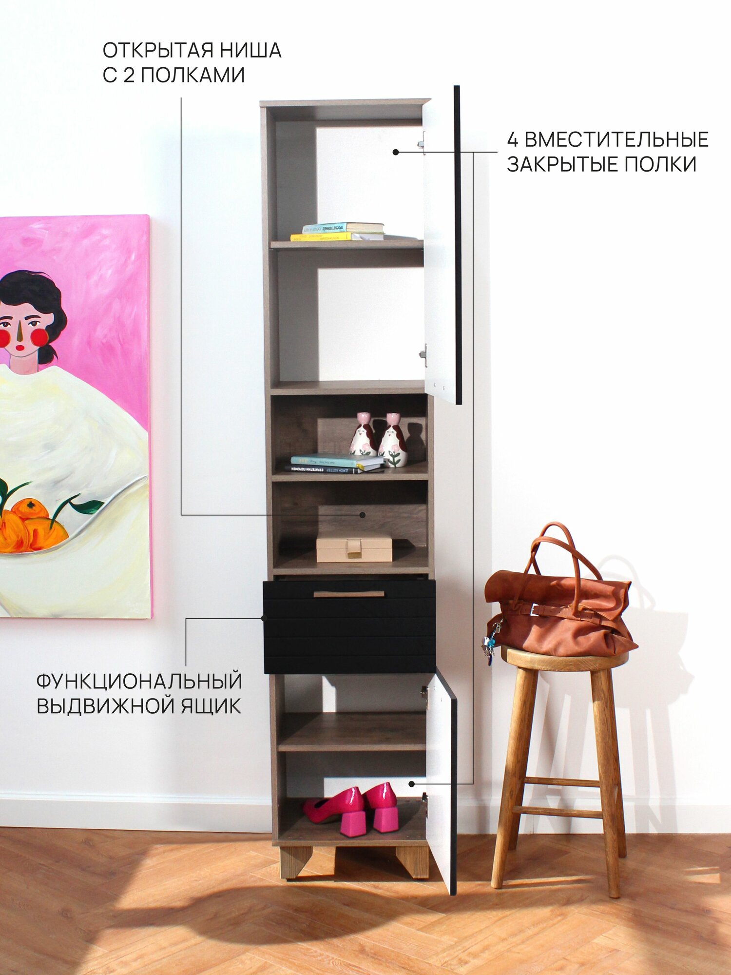 Мебель выполнена в скандинавском стиле и сочетает в себе функциональность и эстетику.