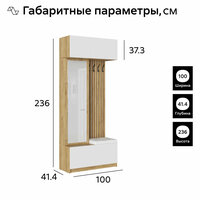 Цвет: Белый, Бежевый Ширина: 100 см Глубина: 41.4 см Высота: 236 см В комплект входит: 1. Антресоль (ШхГхВ): 100 х 39.4 х 37.6 см - 1 шт. 2. Обувница (ШхГхВ): 100 х 39.4 х 45 см - 1 шт. 3. Пенал (ШхГхВ): 50 х 22.6 х 153.4 см - 1 шт. Дополнительно: Глубина изделия по боковине 39.4 см. Внутри антресоли и обувницы есть перегородки, которые делят проем пополам и являются дополнительным ребром жёсткости. Полезная площадь проёмов 47.5 х 39.4 х 34.4 см. Антресоль крепится к стене на навесы уголки с накладкой. На тумбе расположен пуф из кожзаменителя. Чехол выполнен с утяжкой, в основе пуфа поролон 4 см. Размер пуфа 49.6 х 37.6 х 5.6 см. Цвет ткани: Ecotex 3002 / Родео 050 (Белая).