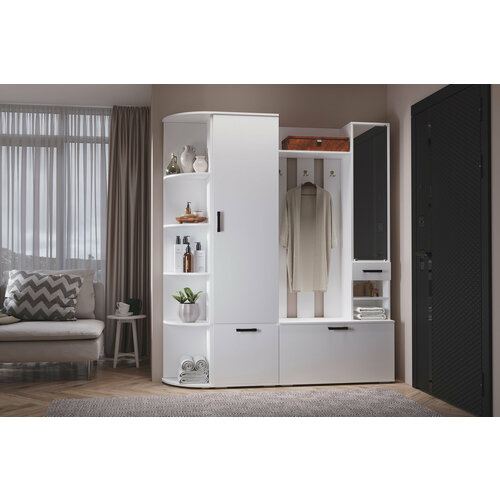 1. Вешалка с зеркалом Ника белый гладкий - В 203.2 x Г 35.4 x Ш 91 см. 2. Вешалка-пенал угловая Ника белый гладкий - В 203.2 x Г 35.4 x Ш 35.4 см. 3. Шкаф бельевой Ника белый гладкий - В 203.2 x Г 35.4 x Ш 50 см.