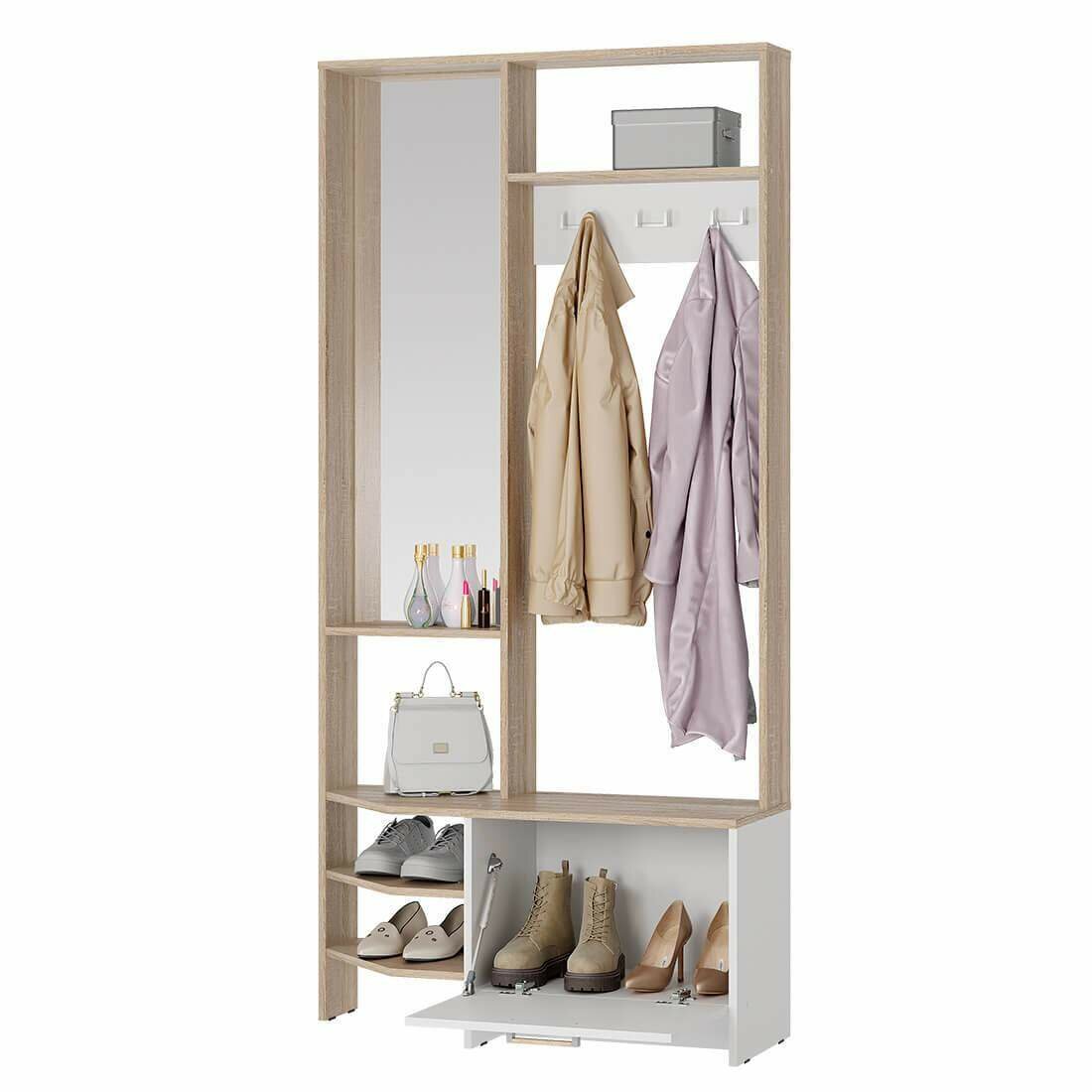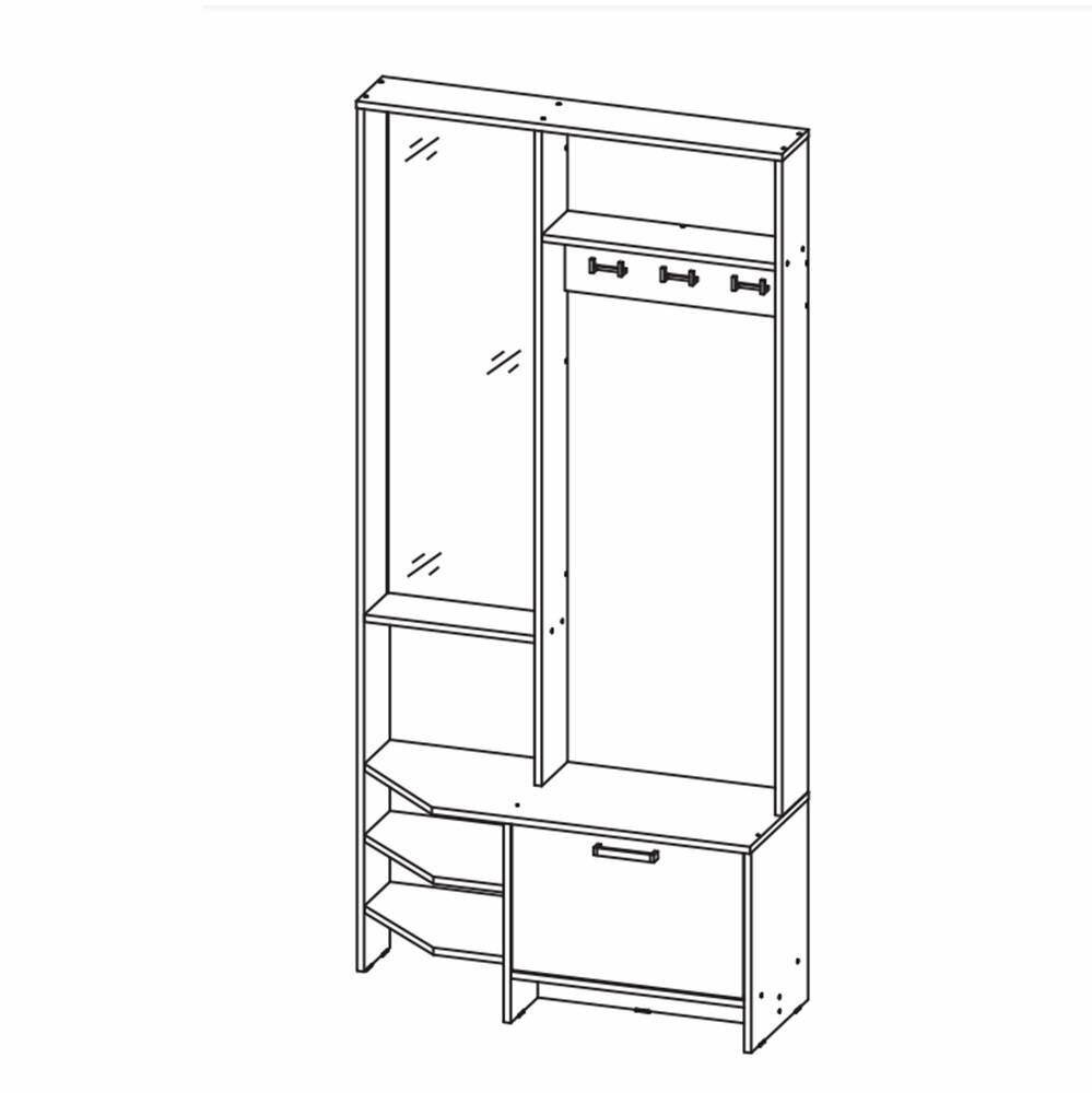 Большое зеркало, открытая верхняя полка для головных уборов и сезонных аксессуаров, крючки для верхней одежды, а также закрытая тумба-обувница и комплект полок для домашней обуви – все, что нужно для Вашего комфорта в прихожей.