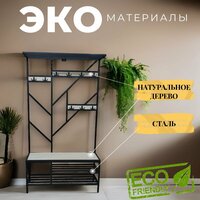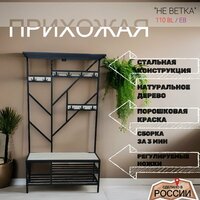 1. Мы используем только натуральное дерево (массив) толщиной 20 мм. Деревянная полочка выкрашена в цвет "эбен" и покрыта двумя слоями высококачественно древесного лака, устойчивого к небольшим механическим повреждениям. 2. Основа прихожей - сварная конструкция из стали 20*20 мм (толщина стенки стали 1.5мм!), окрашенная порошковой краской в цвет черный муар. Сварные соединения выполнены качественно и аккуратно. На задней стороне металлом выполнен рисунок "Веточка". 3. Для сборки достаточно 1 человека и 5 минут Вашего времени, необходимо прикрепить стальную конструкцию размером 150(В)* 110(Ш)см к обувнице размером 50(В)*110(Ш) с помощью приложенных в комплекте 4 болтов и ключа. Верхняя и нижние части - являются цельносварными конструкциями, а не конструктором для сборки. 4. Изделие выдерживает статическую нагрузку до 100 кг. 5. Контроль качества и идеальное исполнение на всех этапах производства: заготовка (резка металла), сварка и зачистка швов, покраска металла в полимеризационной камере, резка и шлифовка дерева, малярные работы по дереву, сборка и особенный акцент на упаковке изделия.
