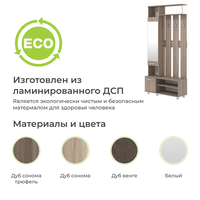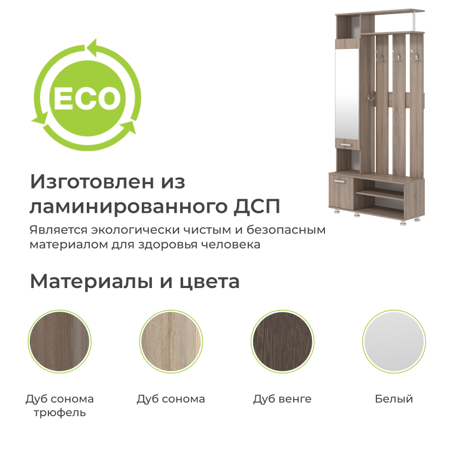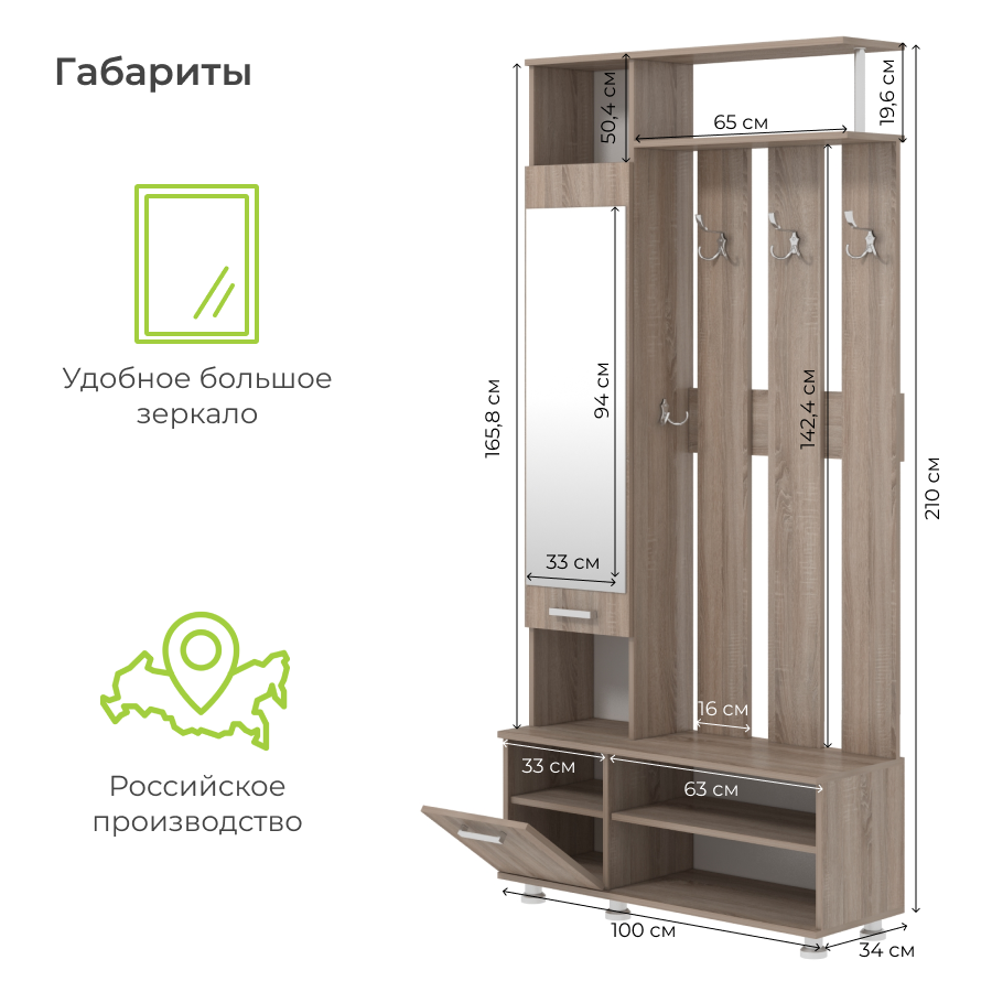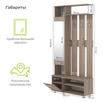 Размер рейки вешалки 16 х 142,4 см Размер прихожей в собранном виде (ШхГхВ): 100х34х210см. Прочный каркас выполнен из ЛДСП.