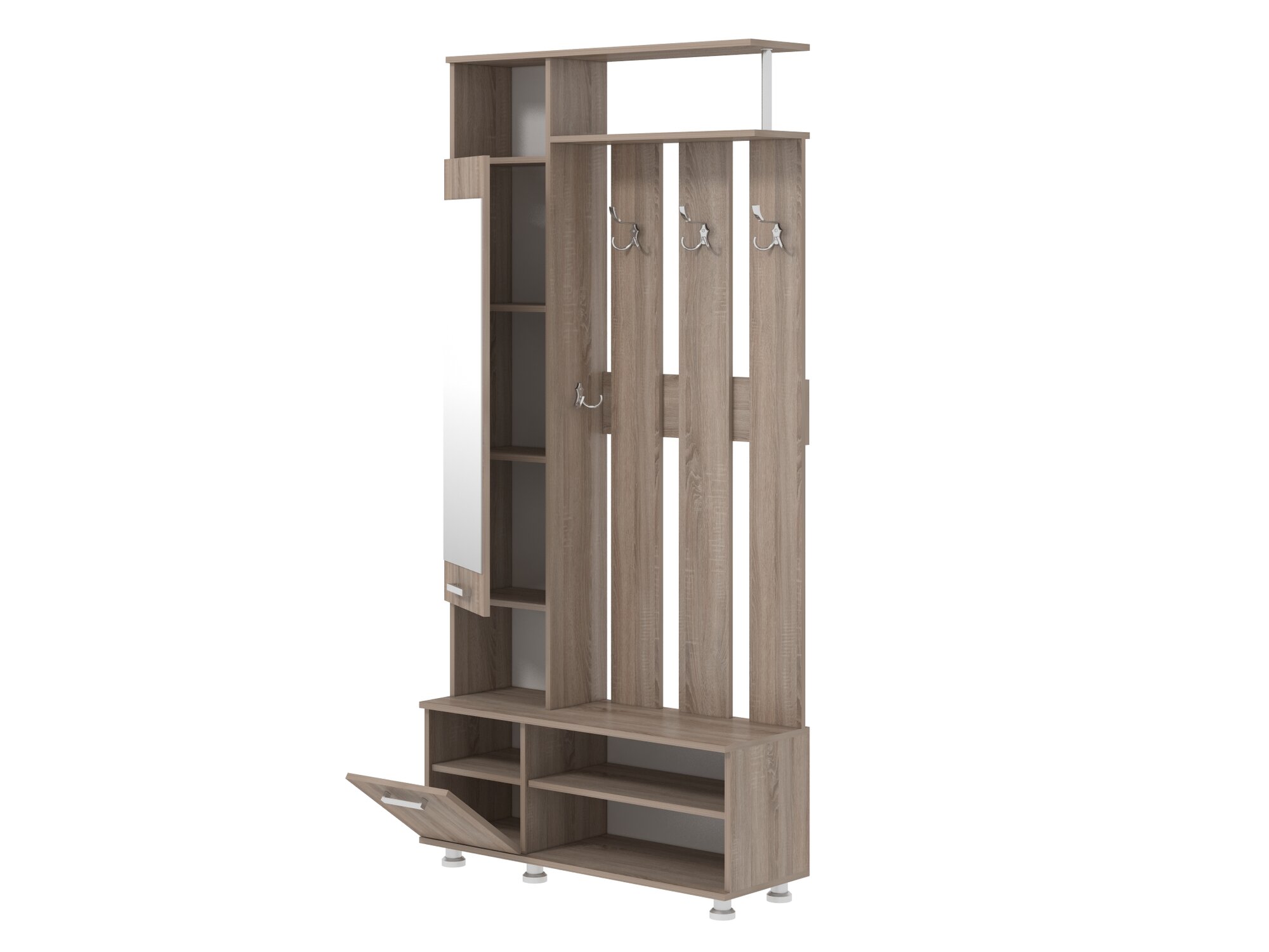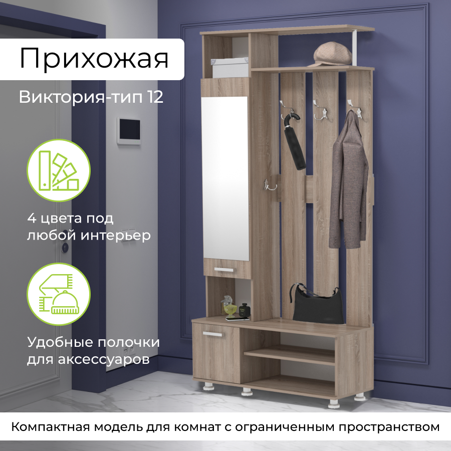 Компактная прихожая «Виктория 12»Дуб Сонома Трюфель оборудована открытой и закрытой обувницей, вешалкой с металлическими крючками и шкафом с зеркалом.