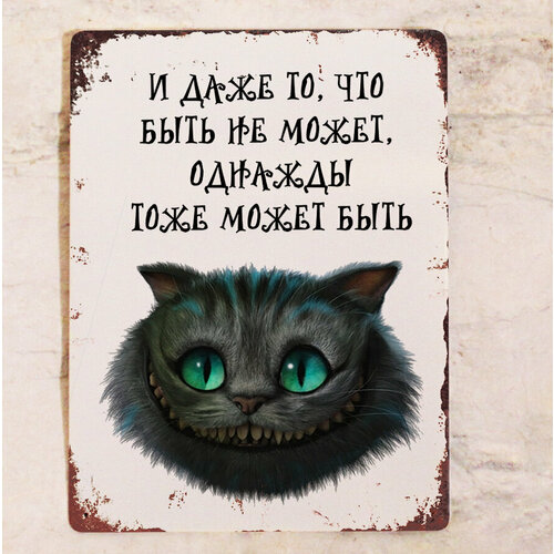 Декоративная табличка с Чеширским котом и надписью "И даже то, что быть не может, однажды тоже может быть" из серии "Алиса в стране чудес" - это стильный и оригинальный элемент декора, который станет ярким акцентом в интерьере вашего дома или дачи. Тема Алиса в стране чудес - декор для тематических праздников и просто фанатов сказки, и эта табличка поможет вам создать волшебную атмосферу. Табличка выполнена из металла, покрытого белой эмалью с полноцветным изображением. Края загнуты, углы скруглены, что придает изделию аккуратный и законченный вид. Размер таблички составляет 20х30 см, что позволяет разместить ее на стене или другой поверхности без труда.