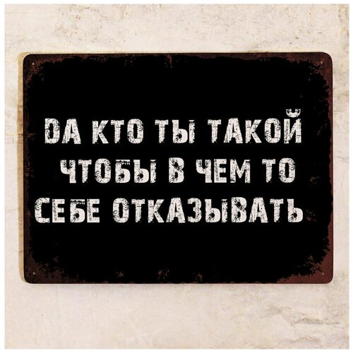 Купить Прикольная жестяная табличка с надписью Да кто ты такой, чтобы себе отказывать, металл, 20х30 см. с доставкой по всей России. Прикольная жестяная табличка с надписью Да кто ты такой, чтобы себе отказывать, металл, 20х30 см.: сравнение цен, характеристики, фото, актуальное наличие и цены.