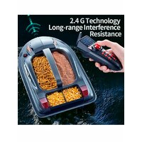 - Стоит отметить и 4 отсека для загрузки прикормки: 2 центральных - из него прикормка сбрасывается под кораблик и 2 соединённых отсека на корме - в него можно удобно заложить животный компонент (опарыш, мотыль, червь и пр.) и сбросить в последнюю очередь, чтобы "животный компонент" был над основной прикормкой.