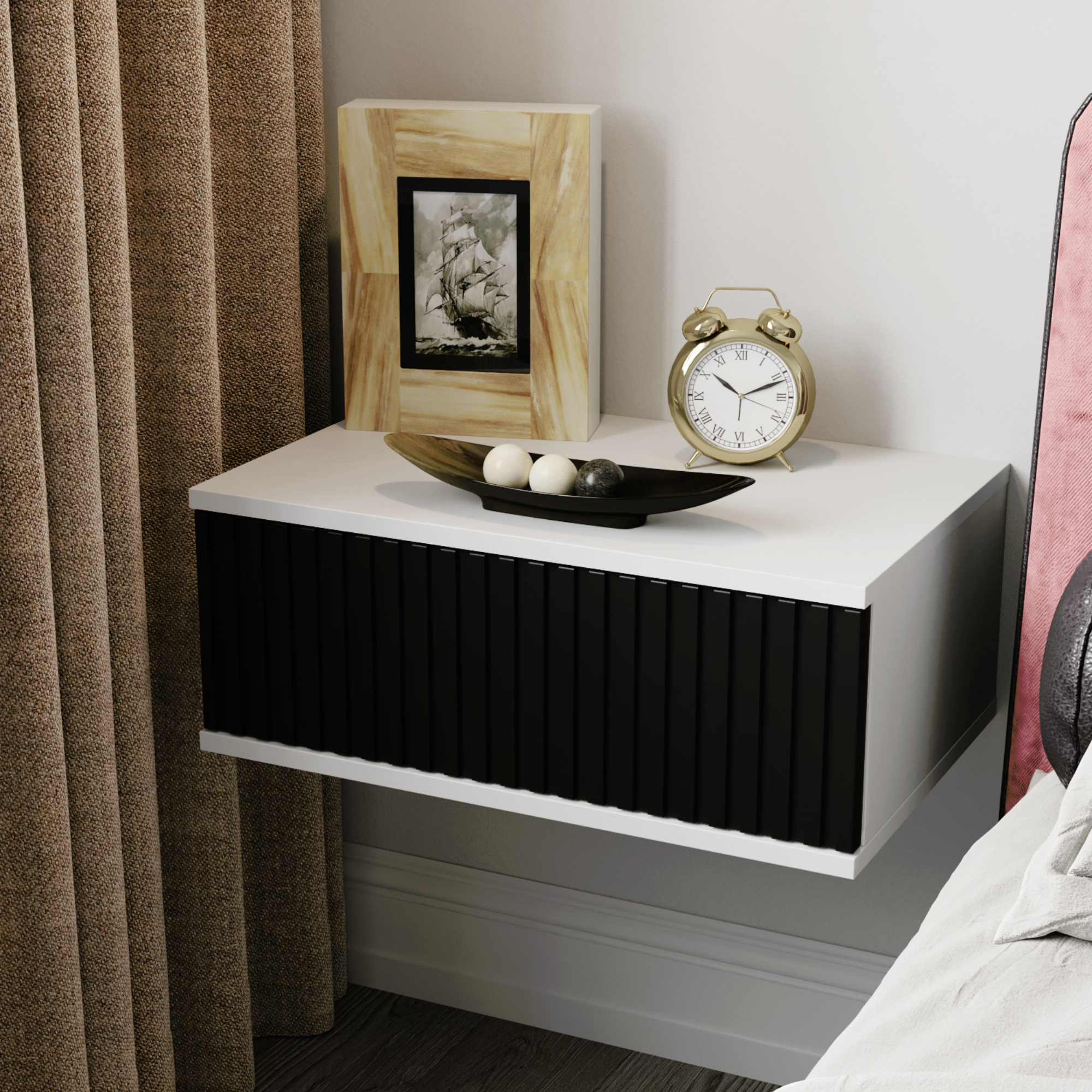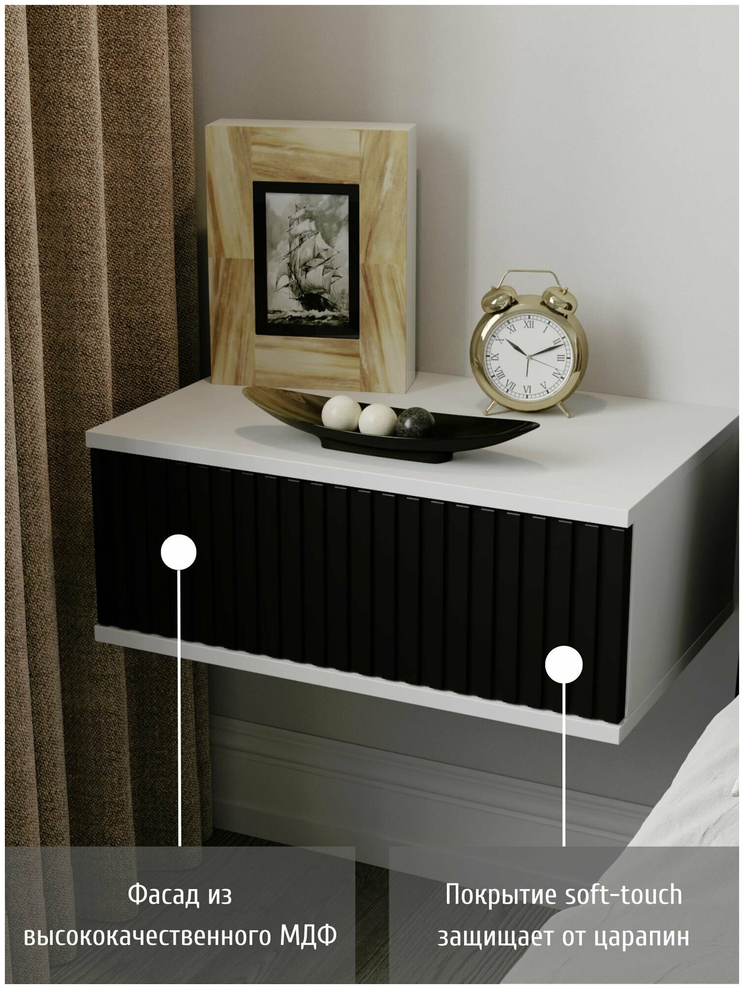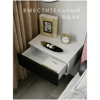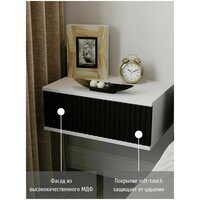 Подвесная прикроватная тумбочка в стильном и элегантном дизайне украсит интерьер Вашего дома и станет функциональным предметом мебели в гостиной, спальне, прихожей, на кухне или детской комнате. Навесная тумба изготовлена из высококачественного и экологически чистого ЛДСП с отделкой МДФ и покрыта защитным покрытием от царапин Soft touch. Оснащена вместительным выкатным ящиком с системой автоматического открывания одним нажатием, высококачественными направляющими с системой невидимого монтажа и надежной подвесной системой с креплением к стене. Тумбочку можно использовать как в спальне как прикроватный стол, так и как тумбу в прихожую или коридор, а в сочетании с зеркалом как туалетный стол, столик на балкон, в ванную или консоль. Навесная тумба не занимает много места и экономит пространство. Детальная и понятная инструкция по сборке и монтажу, а также вся необходимая фурнитура, прилагающаяся в комплекте, делают процесс сборки легким и быстрым. Превосходный подарок на Новоселье.