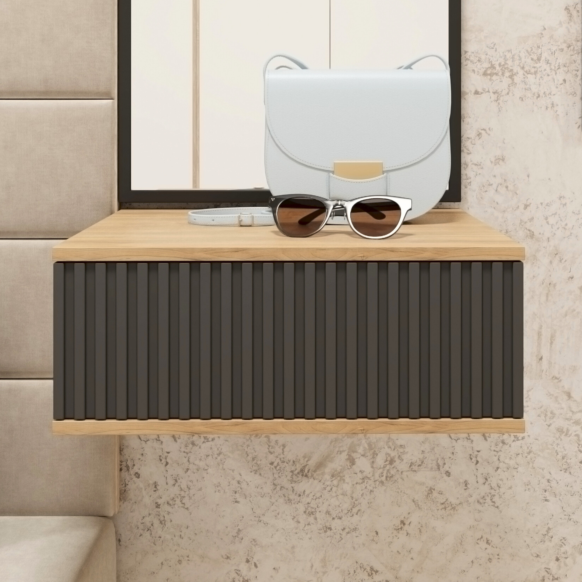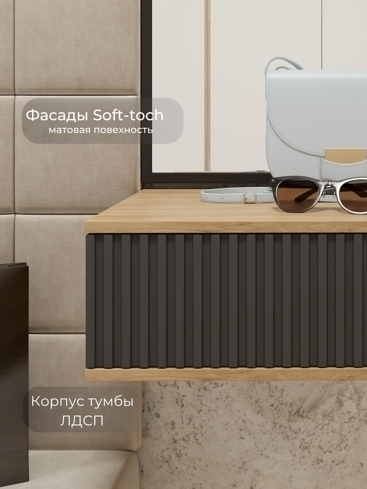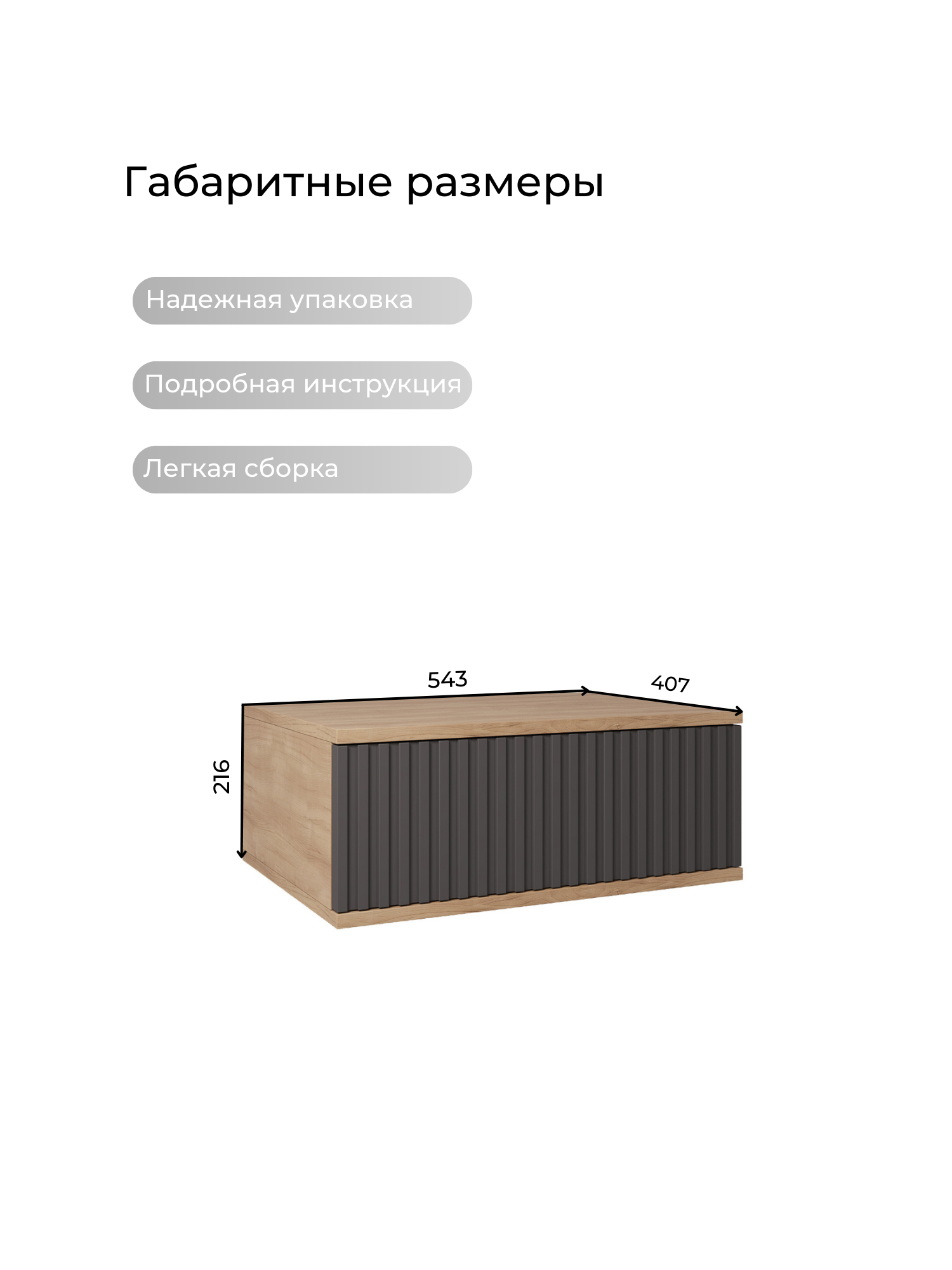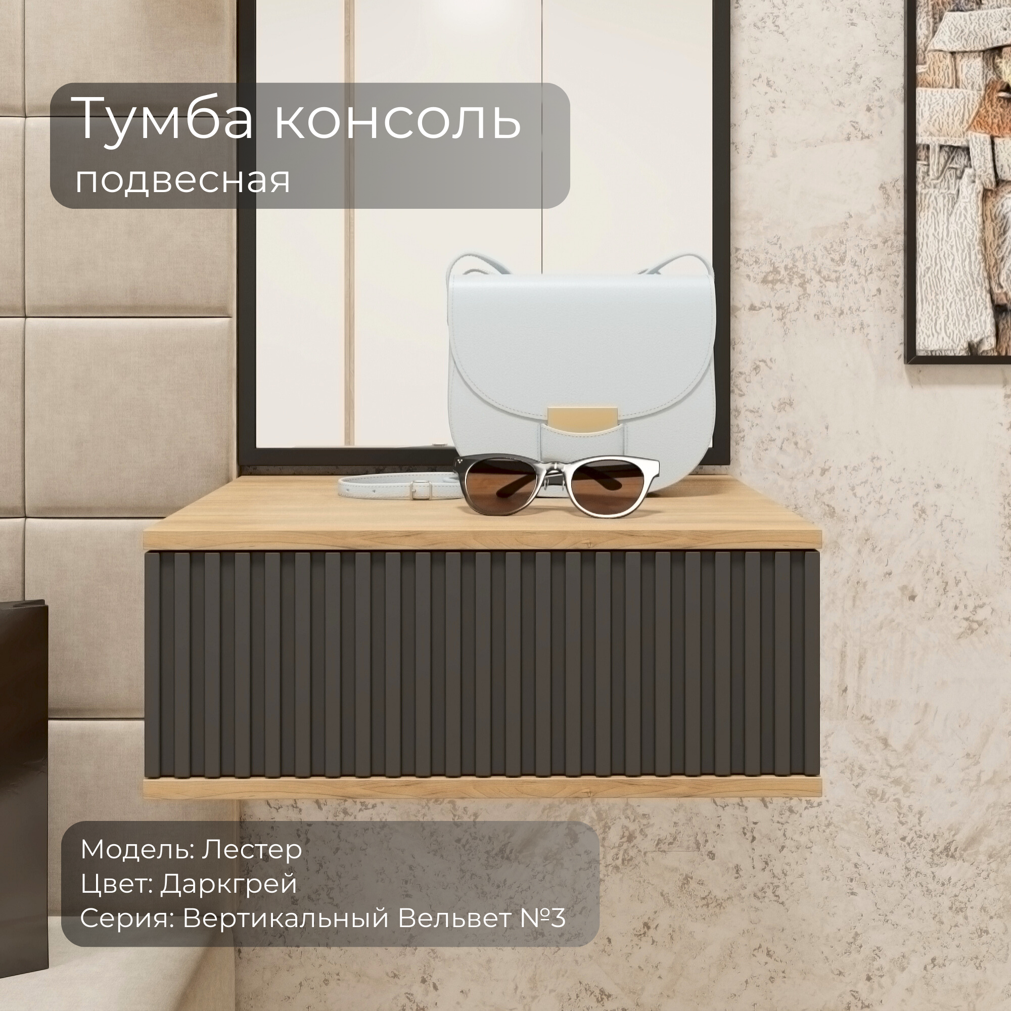 Подвесная тумба в прихожую «Лестер» — это функциональность и стиль. Тумба подвесная в прихожую станет отличным дополнением к вашему интерьеру в классическом стиле, минимализм или лофт. Она сочетает в себе функциональность и стильный дизайн, который подойдет для различных помещений, таких как прихожая, коридор, гостиная, кабинет или прикроватная тумба в спальню и может служить как туалетный столик, шкаф для хранения, стеллаж для книг. Тумба с креплением к стене оснащена ящиком для хранения ключей и мелочей, что делает ее удобной и практичной в использовании. Фасад тумбы выполнен из МДФ с тактильной поверхностью Soft touch, что придает ей элегантный и современный вид. Корпус изготовлен из ЛДСП цвета дуб, что добавляет изделию теплоту и уют. Система открытия от нажатия Push to open обеспечивает удобство использования тумбы, так как вам не придется тратить время на поиск ручки или замка. Навесная тумбочка поставляется в разобранном виде, что облегчает ее транспортировку и установку. Подробная инструкция по сборке позволяет собрать тумбу самостоятельно без особых усилий. Подвесные тумбы в прихожую имеют размеры 21.6х54.3х40.7 см, что делает ее компактной и вместительной одновременно. В комплекте идет одна тумба и инструкция по сборке. Выбирая подвесную тумбу в прихожую, вы получаете стильное и функциональное решение для вашего дома, которое будет радовать вас своей практичностью и удобством использования.