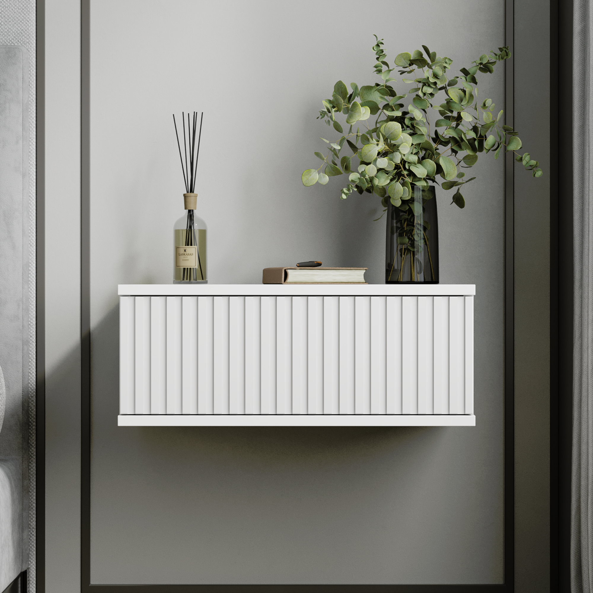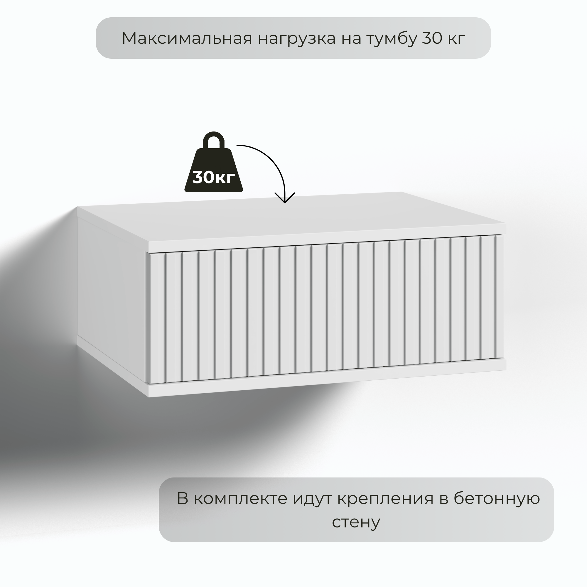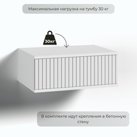 Подвесная прикроватная тумбочка в стильном и элегантном дизайне украсит интерьер Вашего дома и станет функциональным предметом мебели в гостиной, спальне, прихожей, на кухне или детской комнате. Навесная тумба изготовлена из высококачественного и экологически чистого ЛДСП с отделкой МДФ и покрыта защитным покрытием от царапин Soft touch. Оснащена вместительным выкатным ящиком с системой автоматического открывания одним нажатием, высококачественными направляющими с системой невидимого монтажа и надежной подвесной системой с креплением к стене. Тумбочку можно использовать как в спальне как прикроватный стол, так и как тумбу в прихожую или коридор, а в сочетании с зеркалом как туалетный стол, столик на балкон, в ванную или консоль. Навесная тумба не занимает много места и экономит пространство. Детальная и понятная инструкция по сборке и монтажу, а также вся необходимая фурнитура, прилагающаяся в комплекте, делают процесс сборки легким и быстрым. Превосходный подарок на Новоселье.