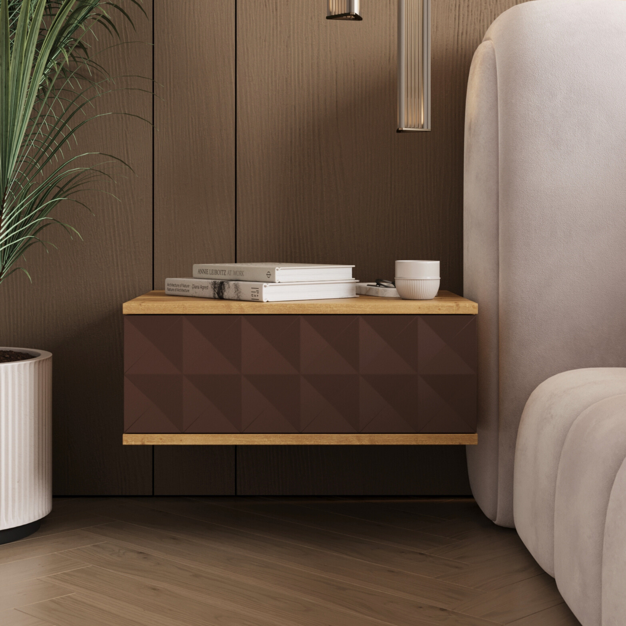 Яркая прикроватная тумба станет отличным декором для вашего дома и квартиры и с легкостью обновит интерьер комнаты. Дубовая подвесная консоль изготовлена из высококачественного и экологически чистого ЛДСП с отделкой МДФ и покрыта защитным покрытием от царапин Soft touch, бархатистым на ощупь. Тумбочка навесная с ящиком что делает ее еще более вместительной и функциональной. Тумба прикроватная навесная отлично подойдет для любой комнаты и любого назначения. Поставьте ее в прихожую, коридор и используйте как туалетный столик для хранения мелочей и аксессуаров. Тумба с полкой можно использовать в качестве компактного рабочего места для косметолога, визажиста или гримера. Тумба с ящиком прекрасно подойдет как мебель для спальни, мебель для детской, мебель для прихожей . Ее отличительный плюс в том что настенная тумба в ванную не занимает много места и экономит пространство. Деревянный шкафчик подойдет даже на балкон что бы сделать уютную зону отдыха с небольшим столом. Наша мебель способна осуществить любую вашу дизайнерскую фантазию. Тумбы в спальню подойдут в качестве аккуратного туалетного столика для макияжа и хранения косметики. Наша мебель для дома - это лучшее решение что бы освежить интерьер.