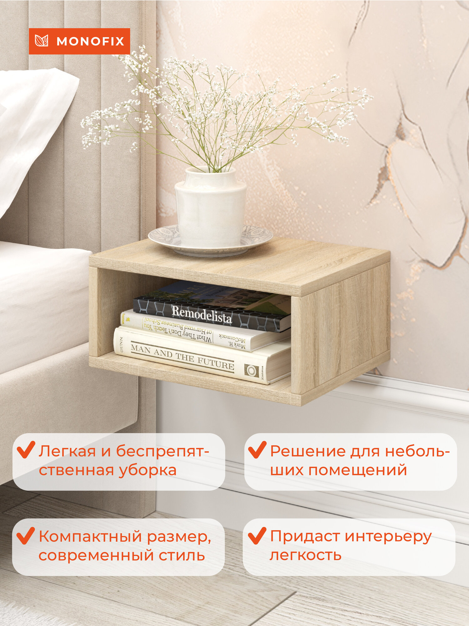 Навесная прикроватная тумба станет прекрасным завершающим элементом интерьера вашей спальной комнаты. "Парящая" мебель - отличное решение для небольших помещений - добавит интерьеру легкости и стиля, облегчает процесс уборки. Компактная и лаконичная подвесная тумба делает композицию визуально легче. Тумба надежно крепится к стене, вся фурнитура входит в комплект к изделию. Каркас тумбочки выполнен из ЛДСП 16 мм. Отличительной особенностью полки являются скрытые крепления, которых не видно с лицевой стороны. Навесная прикроватная тумба одос отлично дополняет коллекции мягкой и корпусной мебели MONOFIX.
