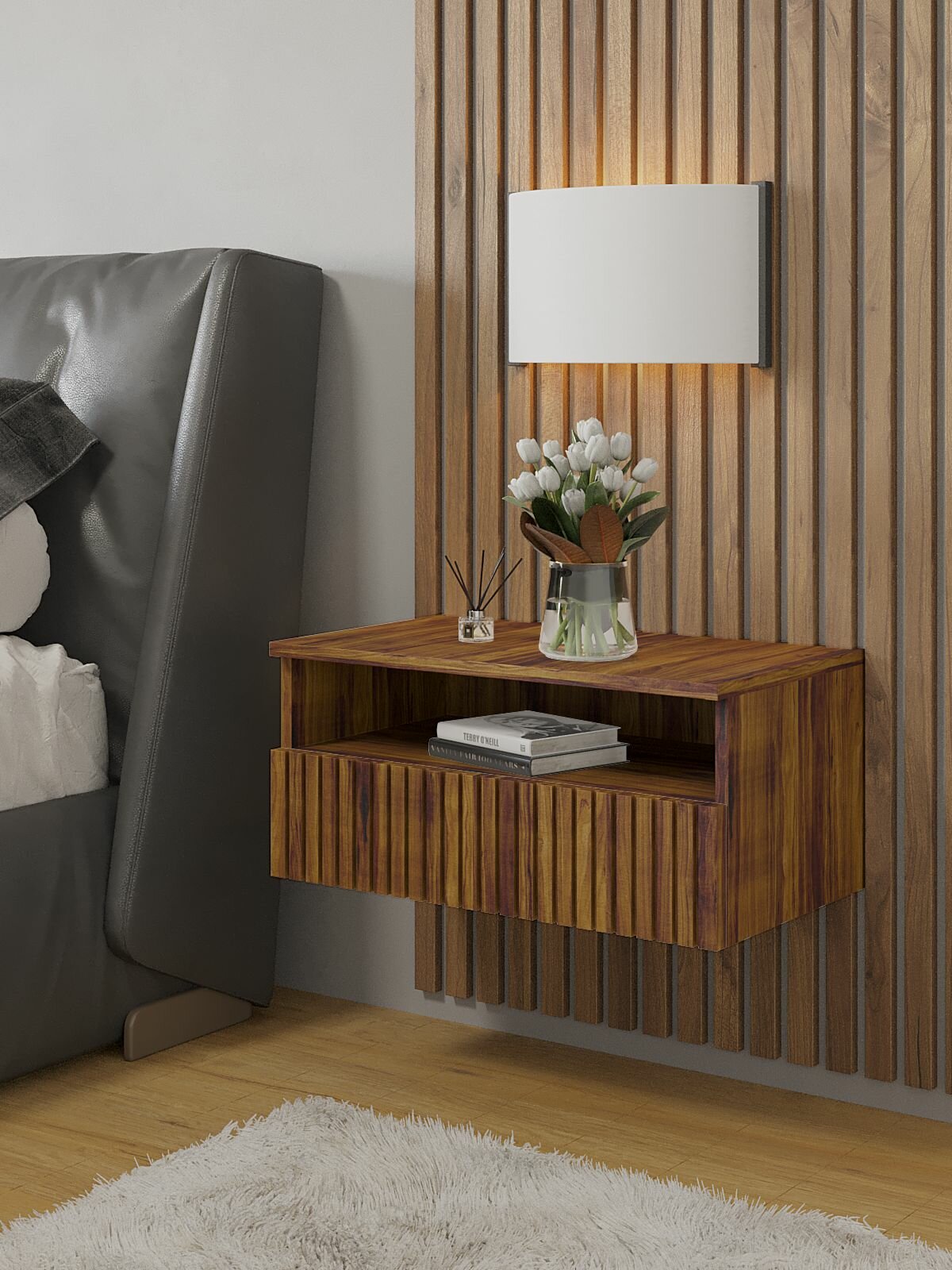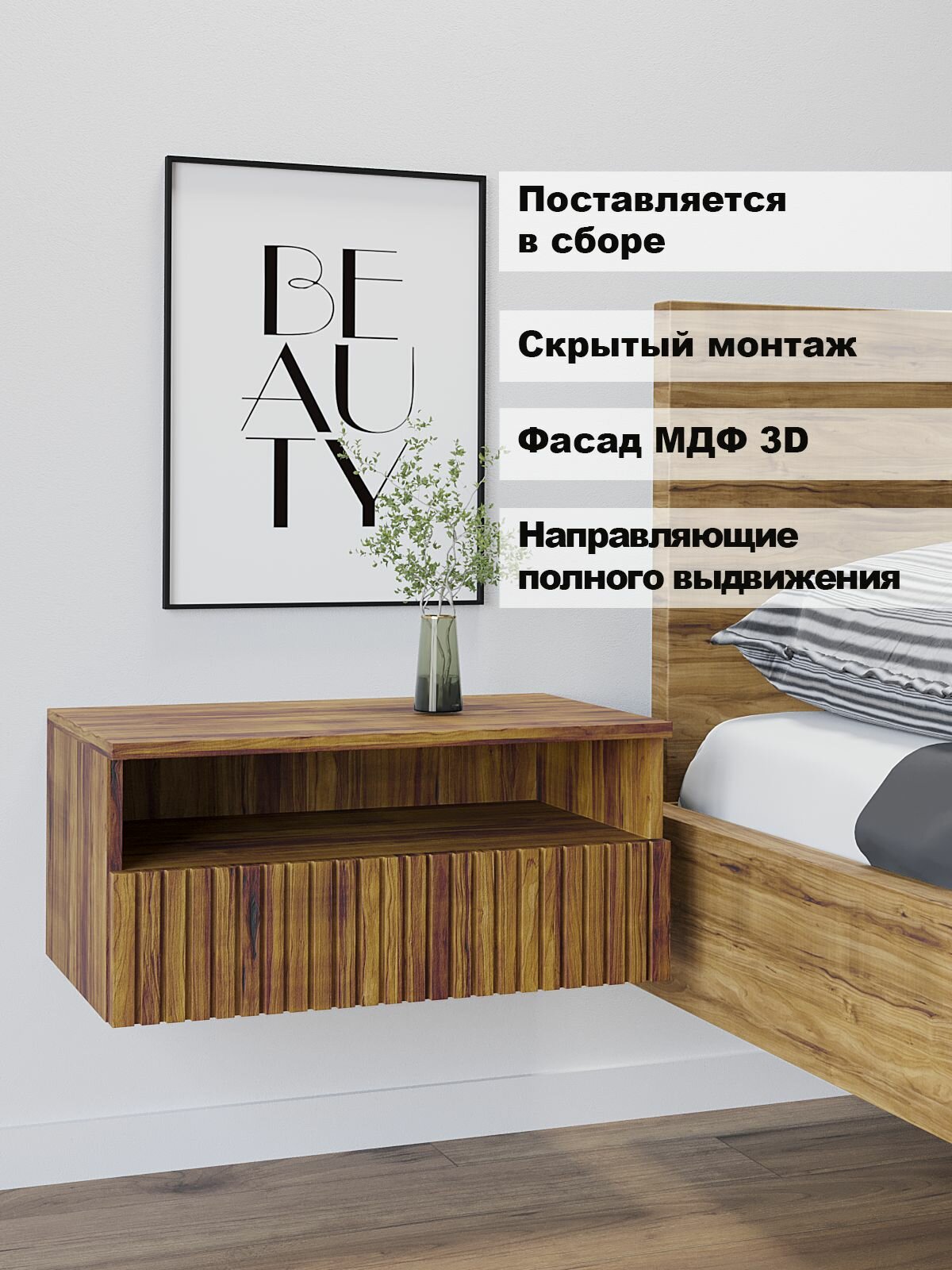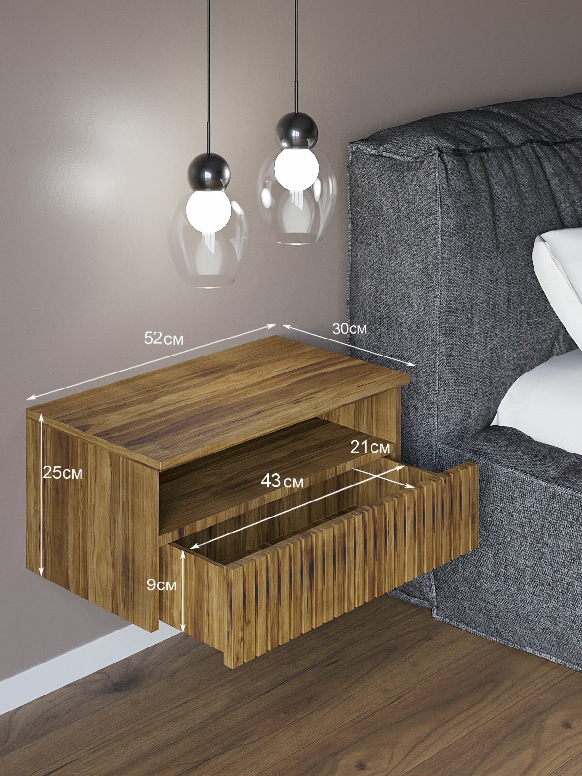 Прикроватная тумба ORBIS «Кросс», подвесная, ЛДСП, МДФ, шариковые направляющие, 52x30x25 см, Вотан