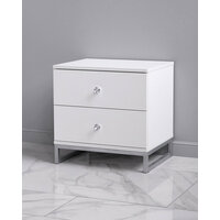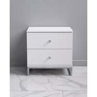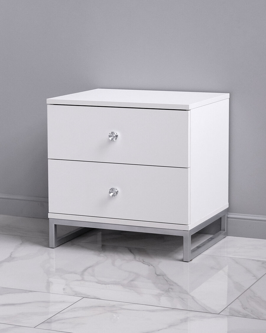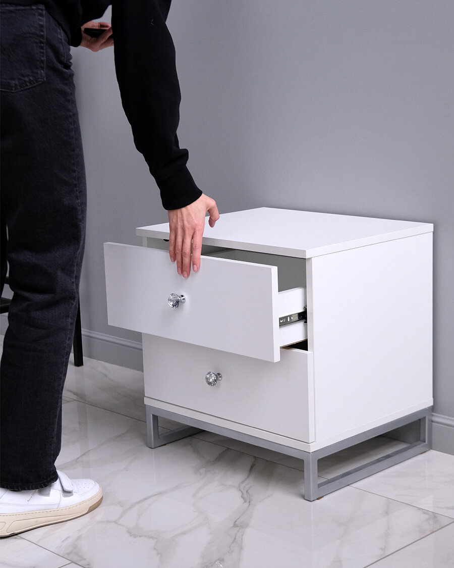 Стильная и лаконичная прикроватная тумбочка с двумя выдвижными ящиками. Материал ЛДСП. Основание из металла, порошковое окрашивание в серебряный цвет. Ящики на шариковых направляющих.