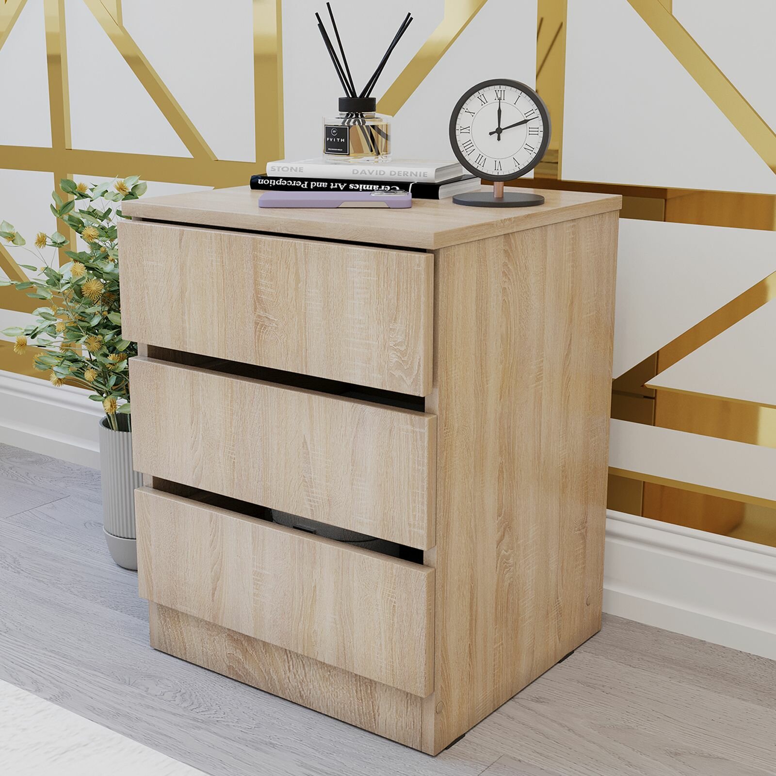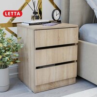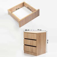 Тумба оснащена тремя выдвижными ящиками на роликовых направляющих, что обеспечивает удобство использования и легкий доступ к содержимому. Отсутствие ручек на фасаде делает дизайн тумбы более лаконичным и современным.