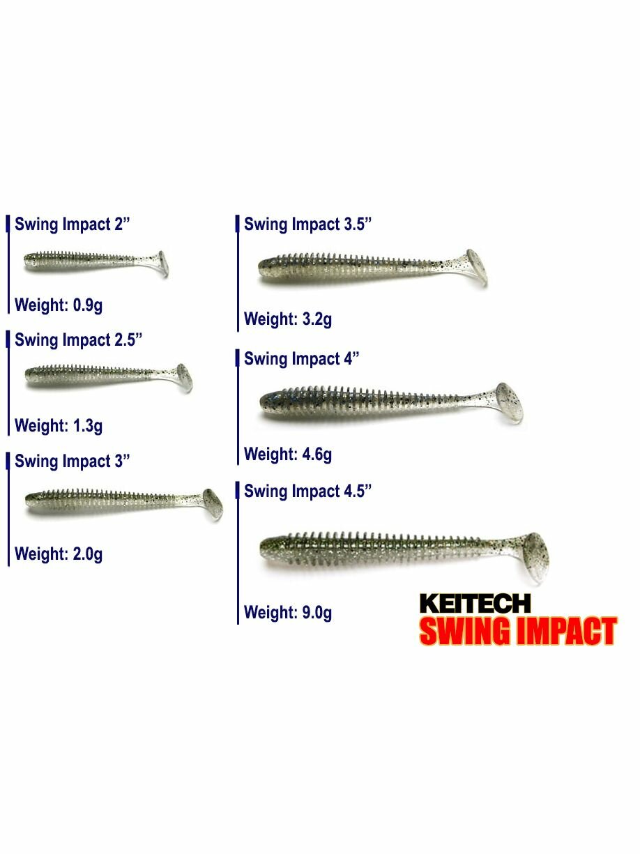 Ребристое тело, из необычайно мягкого «съедобного» силикона, и тончайшая хвостовая пластина позволяют Keitech Swing Impact соблазнительно играть даже на самой медленной проводке, а форма и длина тела прекрасно сочетается с любыми способами монтажа, начиная от джиг-головки и шарнира, заканчивая оснастками «Drop-Shot» и «Каролинской».