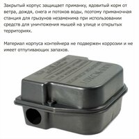 Закрытый корпус защищает приманку, ядовитый корм от ветра, дождя, снега и потоков воды, поэтому приманочная станция для грызунов незаменима при использовании средств для уничтожения мышей на улице и открытых территориях.