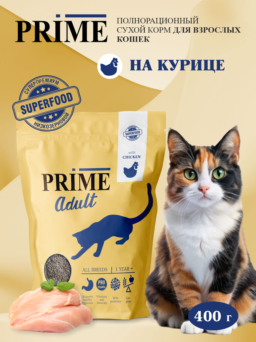 Сухой корм PRIME ADULT для взрослых кошек с курицей 400гр: сравнение цен, характеристики, фото, актуальное наличие и цены.