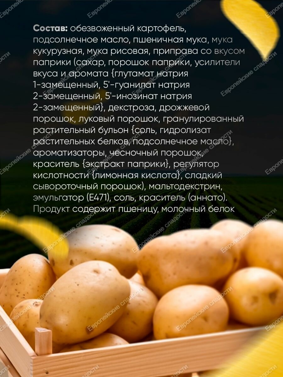| Состав | Обезвоженный картофель, растительные масла (подсолнечное, кукурузное), рисовая мука, пшеничный крахмал, приправа со вкусом паприки (сахар, порошок паприки, усилители вкуса и аромата: однозамещенный глутамат натрия, 5-инозинат натрия 2-замешенный, 6-гуанилат натрия 2-замещённый), дрожжевой порошок, декстроза, луковый порошок, гранулированный растительный бульон (соль, гидролизат растительных белков, подсолнечное масло), чесночный порошок, краситель (экстракт паприки), регулятор кислотности (лимонная кислота), экстракт паприки чили, порошок сыворотки (молоко), эмульгатор (E471), мальтодекстрин, соль, краситель аннато. |