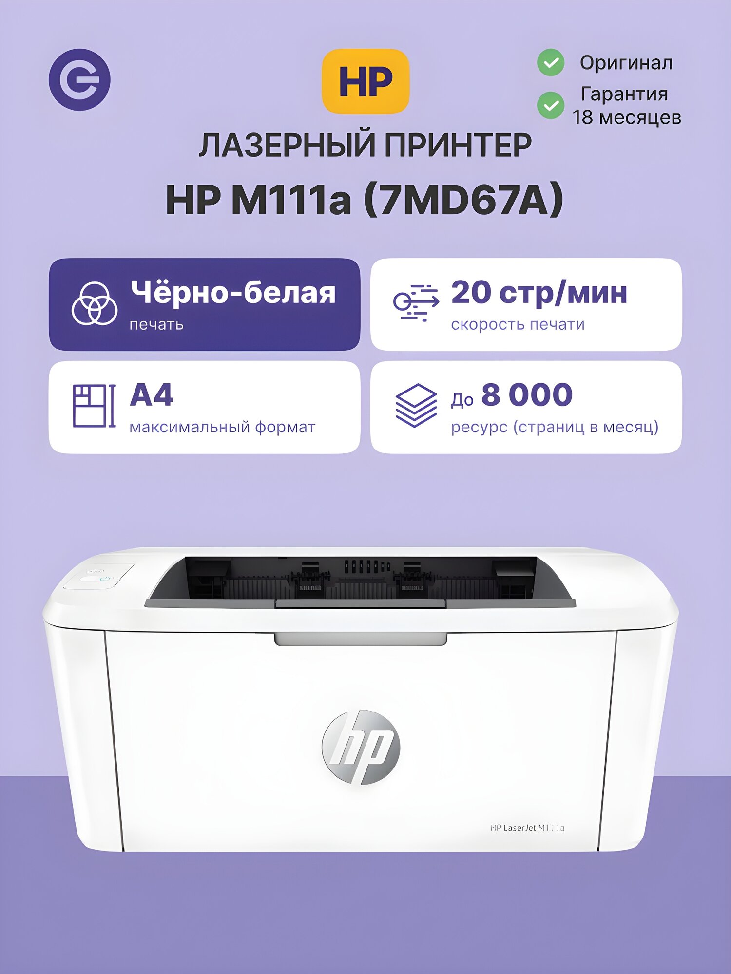 Принтер HP LaserJet M111a 7MD67A, лазерный, черно-белая печать, A4, 20 стр/мин, память 32 МБ, USB: сравнение цен, характеристики, фото, актуальное наличие и цены.