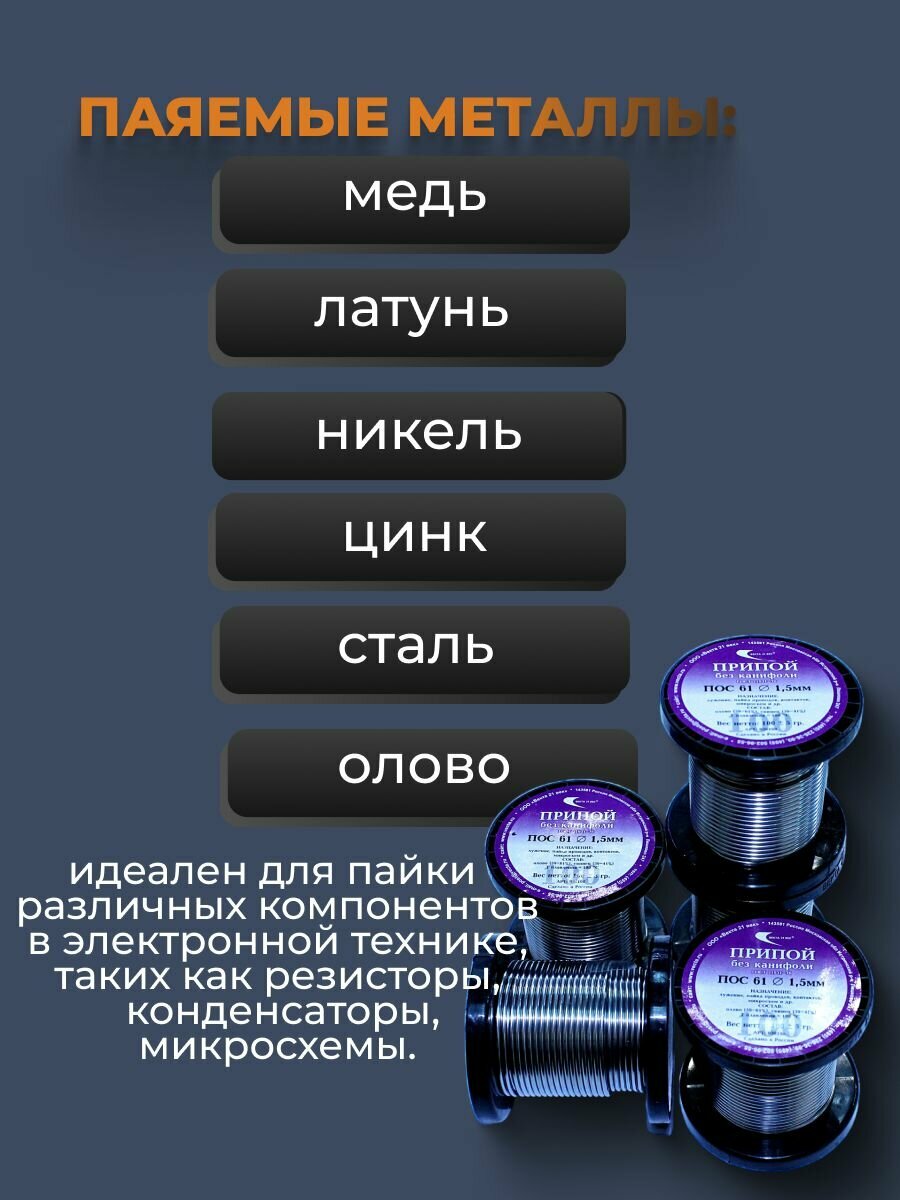 Припой оловянно-свинцовый ПОС 61 без канифоли диаметр 1,5 мм предназначен для лужения, пайки проводов, контактов, микросхем и др.