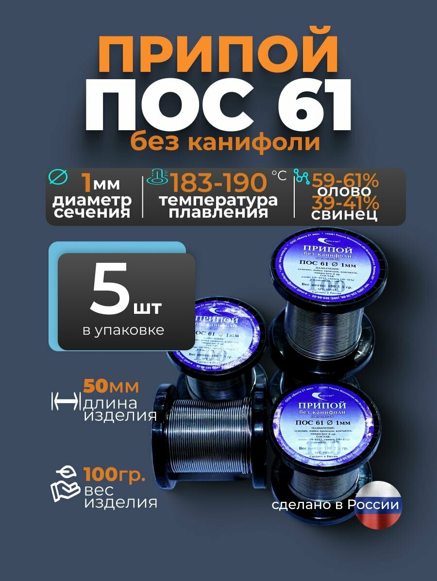 Припой оловянно-свинцовый ПОС 61 без канифоли диаметр 1,5 мм предназначен для лужения, пайки проводов, контактов, микросхем и др.