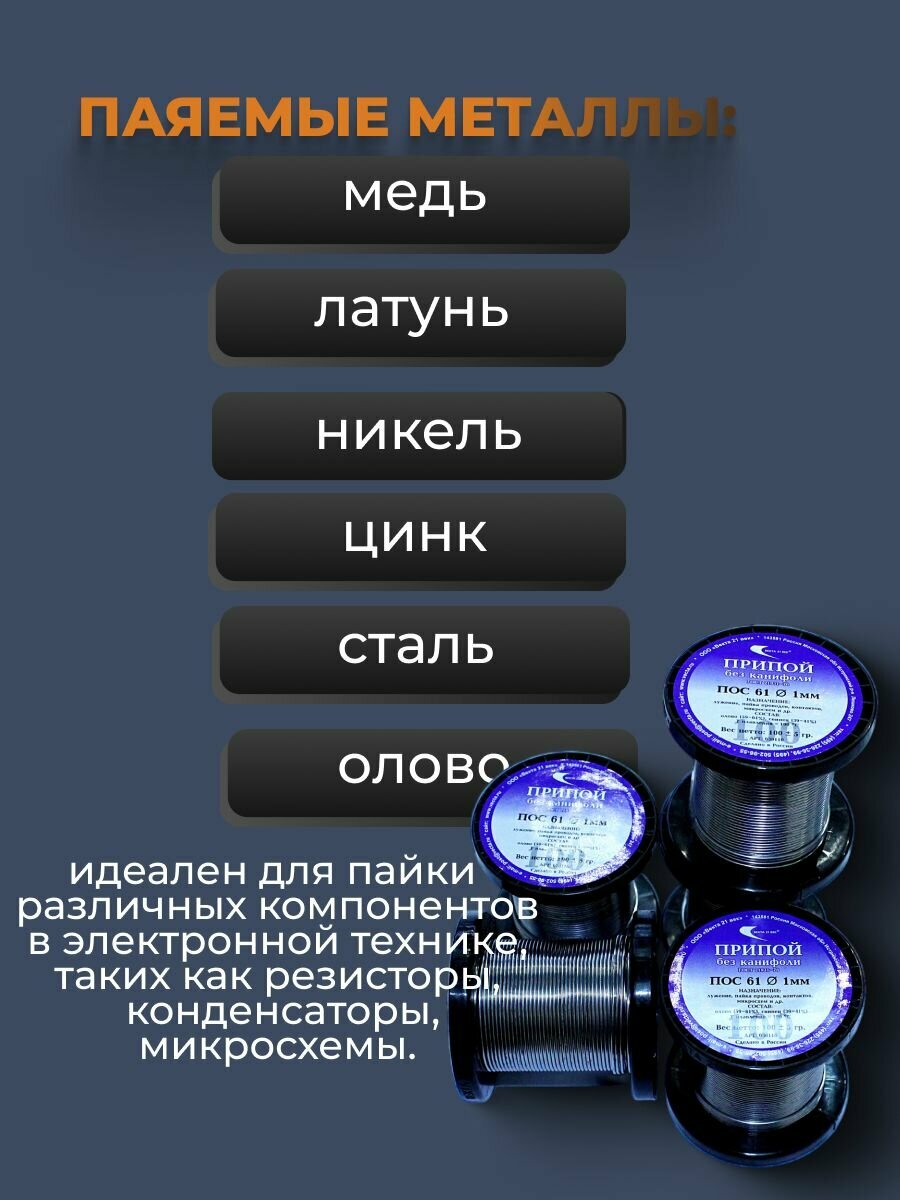 Область применения: ручная и автоматизированная пайка радиоэлектронных компонентов, производство электротехники, металлические изделия, металлизированная поверхность керамики и пластмассы, витражи.