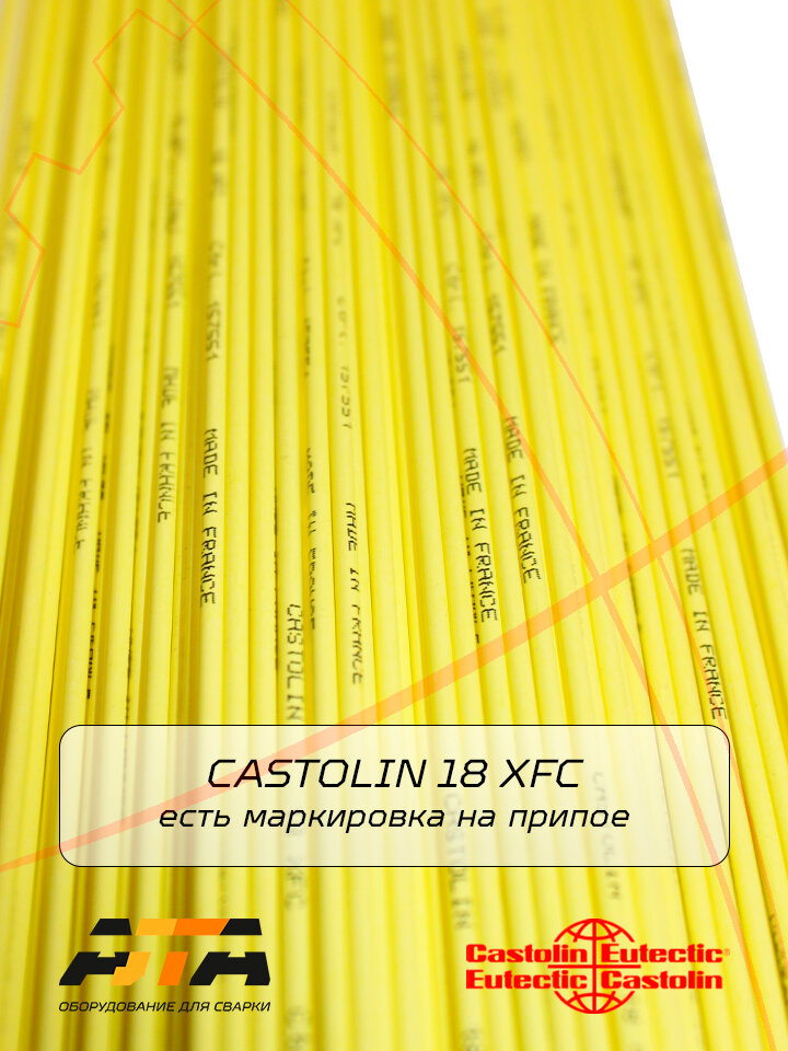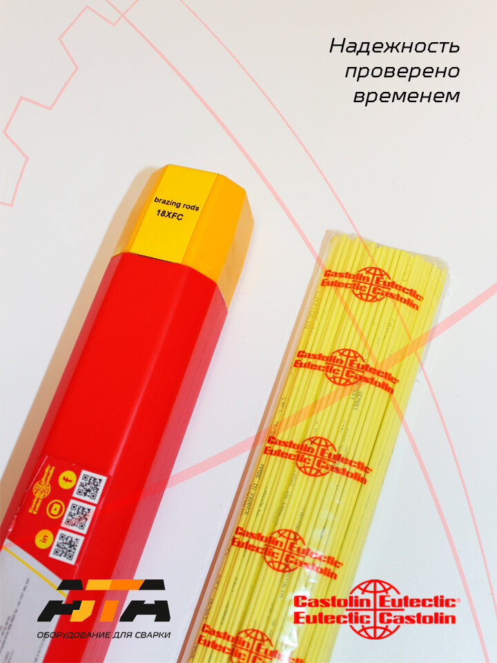 Castolin 18 XFC - припой ( твердый, латунный, офлюсованный, гибкий пруток Ø 2 мм x 500 мм ) для капиллярной пайки - сварки углеродистых, легированных, нелегированных, высококачественных сталей в любых положениях, оцинкованной стали, никель, никелевых сплавов, меди, медные сплавы (Ts>950ºС), чугуна (GTW).