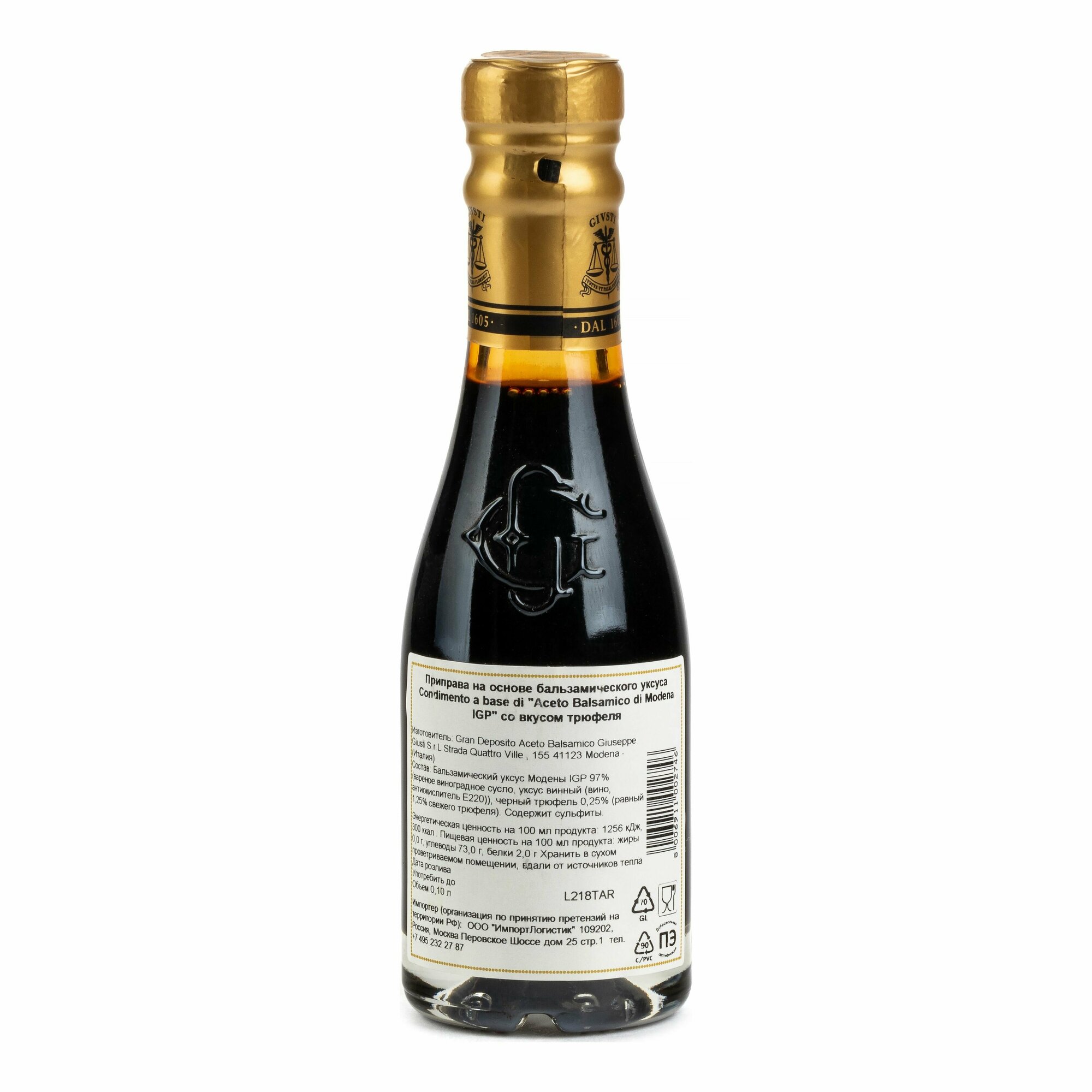 Приправа на основе бальзамического уксуса с трюфелем сделана с использованием винограда, собранного на территории Модены, в северной области Италии под названием Эмилия - Романьи. Бальзамический уксус Модены IGP /Aceto Balsamico di Modena IGP придаёт приправе богатый, бархатный и вязкий вкус традиционного итальянского продукта высочайшего качества. Маркировка IGP означает, что продукт произведён и переработан в соответствии со строгим регламентом в конкретном географическом месте, признанном ЕС. Приправа с трюфелем - это полностью натуральный продукт, содержащий только винный уксус, варёное виноградное сусло и чёрный трюфель. Упакованная в практичные и красивые стеклянные бутылки с пробкой, она становится отличным подарком не только для гурманов, но и обычных любителей готовить. Данный продукт - это своеобразная альтернатива на кухне. Приправа имеет более низкую степень кислотности, чем Бальзамический Уксус из Модены, что делает её идеальной для тех, кто предпочитает не слишком острый и интенсивный вкус.