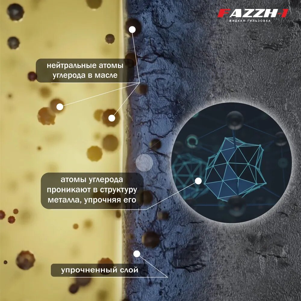 При добавлении ФАЖ-1 в моторное масло, углеродные материалы под воздействием давления и высоких температур проникают в структуру металлов двигателя, повышают микротвердость поверхности и формируют защитное покрытие на основе молекулярного углерода.