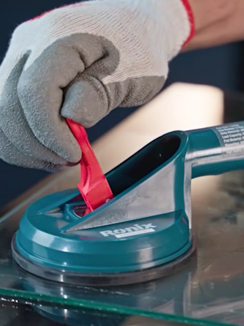 Стеклодомкрат — это незаменимый инструмент для подъёма и перемещения стекла, кафеля и других гладких материалов, которые сложно ухватить руками. Он пригодится, если нужно перенести или поднять предмет, не имеющий специальных приспособлений для захвата. Стеклодомкрат способен справиться с любыми материалами, которые имеют гладкую поверхность и не превышают его грузоподъёмность. С его помощью можно перемещать мебель, тяжёлые столешницы, поднимать фрагменты пола, плитку, автомобильные стёкла, зеркала и многое другое. Ronix — идеальный вариант для тех, кому необходимо поднять груз до 50 кг. Благодаря своей присоске из прочной резины, данный стеклодомкрат будет вашим незаменимым помощником в самых трудных работах. Диаметр присоски составляет 115 мм, он универсален и справится с подъемом таких материалов, как кафель и стекло. Осуществляется прочный захват благодаря ручному насосу с прочной антискользящей рукоятью из материала PA6. Также модель оборудована выпускным клапаном и быстросъемным резиновым блоком