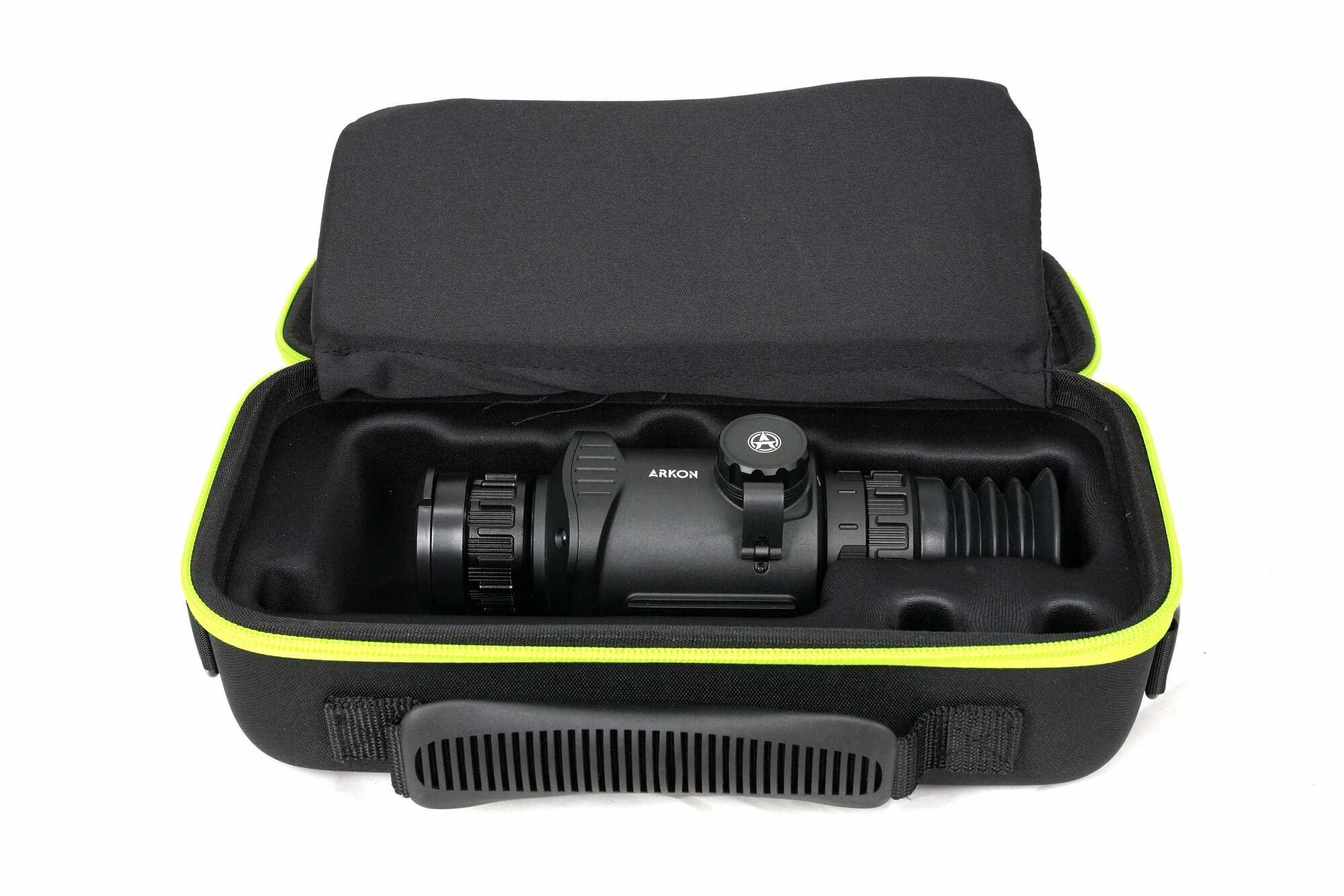 Оптический модуль Arkon Arma SR25 построен на длиннофокусном германиевом объективе 25мм/F1.0, имеющем показатель базовой кратности 3,1х. Для масштабирования изображения имеется цифровая функция Digital zoom, доступная в пределах от 1х до 4х. Благодаря этому максимальное увеличение составит 12,4х. Угол пространственного поля зрения FOV (Field of view) на минимальной кратности равен 7.0°×5.4°. В линейных размерах стрелок будет видеть перед собой область пространства размером 12,2 на 9,4 метра на удалении 100 метров. Фокусировка на дистанцию выполняется вручную, поворотом низкопрофильного кольца на объективе.