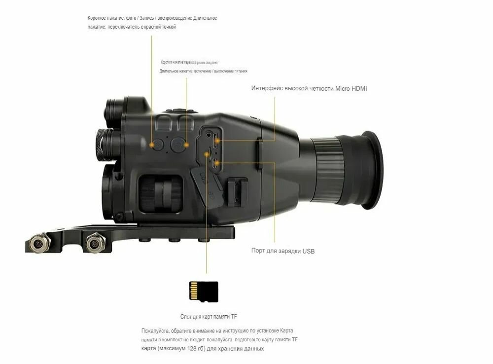 Максимальный объем памяти составляет 128 ГБ ТF-карты, которая может работать на высокой скорости без зависаний. Вы можете использовать USВ-кабель для подключения к компьютеру и передачи данных. Лазер виден невооруженным глазом, а кнопка управляется для включения в темноте, может помочь определить местонахождение удаленной целевой позиции вовремя.