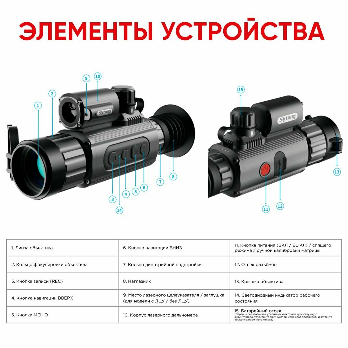 влагозащита, дальномер, защита от пыли, лазерный целеуказатель, откидная крышка, отстройка параллакса, подсветка, подстройка диоптрий, прицел закрытого типа, прицельная сетка, с баллистическим калькулятором, с компасом, ударопрочный корпус, функция zoom, элементы питания в комплекте