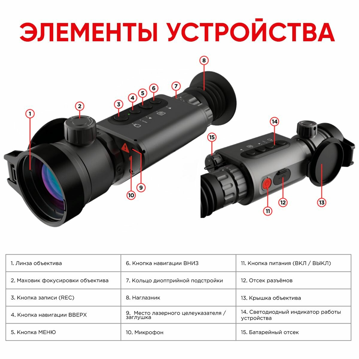 влагозащита, дальномер, защита от пыли, лазерный целеуказатель, отстройка параллакса, подсветка, подстройка диоптрий, прицельная сетка, с баллистическим калькулятором, ударопрочный корпус, элементы питания в комплекте