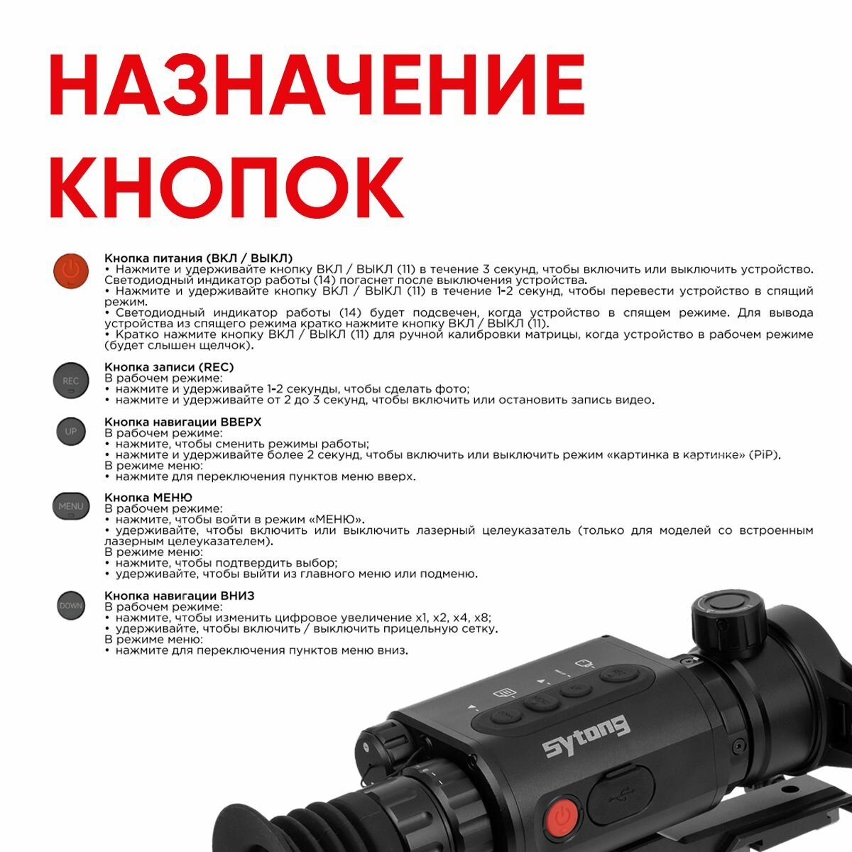 Sytong PM03-35 — высококачественный прицел, одно из лучших сочетаний "цена + качество" на рынке. Сенсор с разрешением 384x288 пикселей и объектив 35мм обеспечивает качественную ночную и дневную картинку на OLED дисплей с разрешением 1024x768. Аккумулятор 18650 ёмкостью 3500 мАч обеспечивает до 5 часов автономной работы. Питается прибор от съёмного аккумулятора 18650 (с плоскими контактами без платы защиты). Он не боится песка, снега и дождя, работая, как часы, при любой погоде — в этом ему помогают исполнение в корпусе со степенью пыле- и влагозащиты IP66, а также широкий температурный диапазон: от -20 до +50 градусов Цельсия. Встроенный WiFi обеспечивает возможность управлять прибором с помощью мобильного приложения на смартфоне. Комплектация: • прицел РМ03 – 1шт; • кабель USB Туре-С; • адаптер зарядного устройства 100-240В / USB 5B 2A 10Вт; • аккумуляторная батарея 18650 3.7В без платы защиты; • кронштейн (с винтами и шестигранными ключами); • кейс на молнии с ремнём для ношения; • руководство пользователя. Все изделия проходят строгий контроль качества и имеют гарантию от производителя на 2 года. C 2001 года компания QUARTA является широкопрофильным дистрибьютером, одним из лидеров российского рынка снаряжения для активного отдыха. Представляем больше 100 брендов, поставляем товары по России, странам СНГ и еаэс, принимаем участие в профильных выставках и организовываем собственные мероприятия для профессионалов. Благодарим наших покупателей за доверие на протяжении многих лет и желаем удачных покупок!