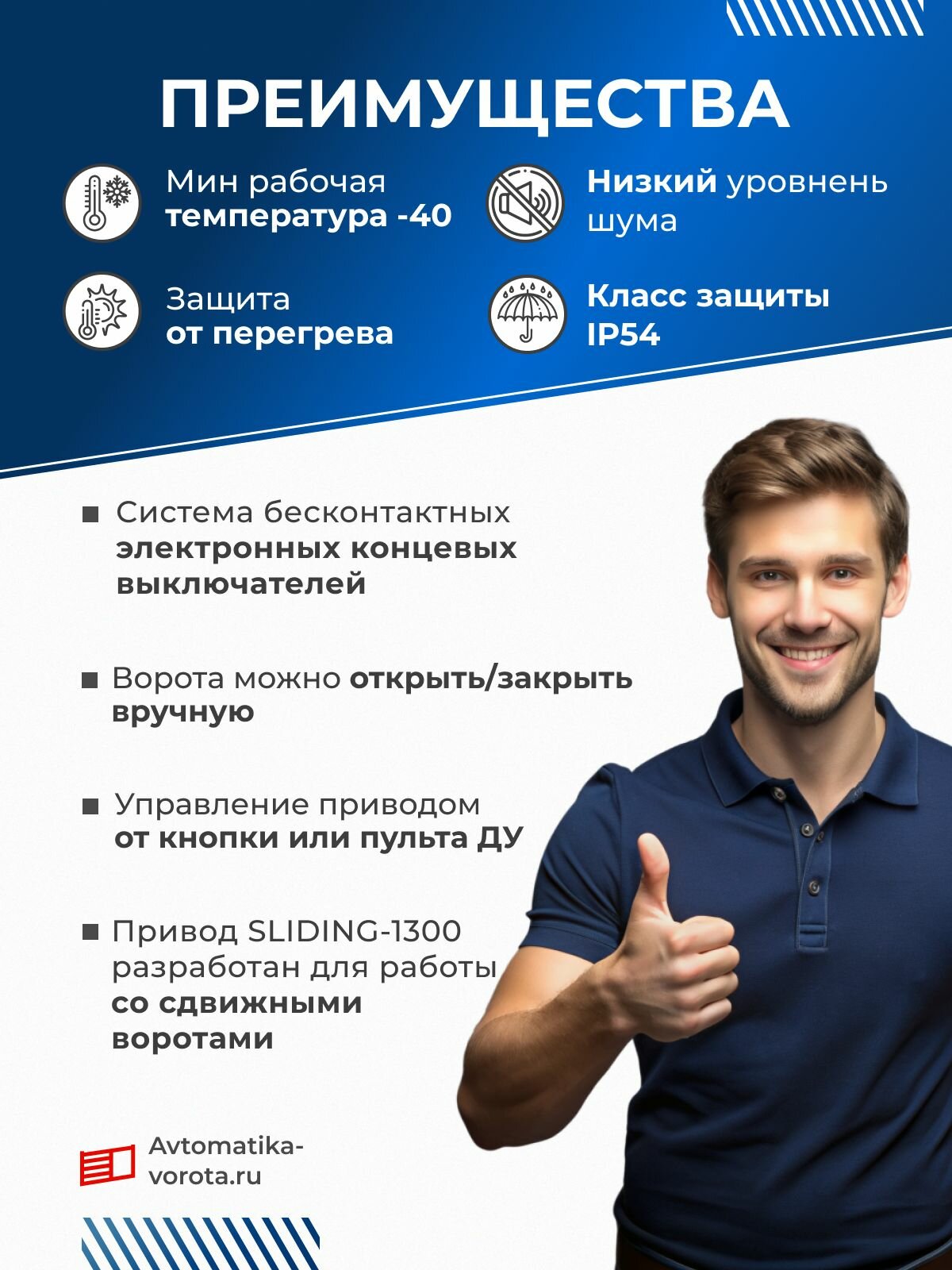 Привод Sliding-1300 предназначен для автоматизации сдвижных ворот без врезной калитки. Он состоит из механического редуктора в масляной ванне и электродвигателя со встроенным блоком управления. Редуктор и двигатель выполнены в едином корпусе. Вращательное движение выходной звездочки преобразуется в поступательное движение ворот с помощью зубчатой рейки, закрепленной на воротах. К блоку управления подключается внешняя кнопка управления. Самоблокирующийся редуктор обеспечивает механическую блокировку ворот, если двигатель не работает. В случае отключения питающего напряжения аварийный расцепитель позволяет открывать и закрывать ворота вручную. Основные функции • Система бесконтактных электронных концевых выключателей быстро и надежно останавливает работу мотора в крайних положениях. • В случае отсутствия электроэнергии поворот рычага расцепляет привод, после чего ворота можно открыть/закрыть вручную. • Возможно управление приводом от стационарной кнопки или пульта ДУ в пошаговом режиме (открыть — стоп — закрыть — стоп). • Блок управления расположен внутри корпуса привода вместе с мотор-редуктором. Привод обладает низким уровнем шума и защитой от перегрева. Автоматический привод Sliding-1300 разработан для работы со сдвижными воротами. Не применяйте его в других целях.