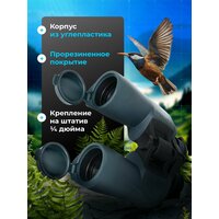 В качестве материала для корпуса бинокля не случайно выбран сверхпрочный углепластик, позволивший снизить вес и не потерять в надежности конструкции. Прорезиненное покрытие обеспечивает надежный хват даже мокрыми руками или заснеженными рукавицами. Также это покрытие способно погасить часть энергии удара при падении или столкновении бинокля с ветвями деревьев или экипировкой. Межзрачковое расстояние регулируется в широких пределах, позволяя настраивать оптику на физиологические особенности подростков и взрослых. В конструкции бинокля предусмотрена возможность ведения наблюдений из стационарного положения при помощи стандартного L-адаптера (приобретается отдельно).