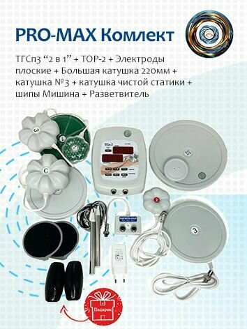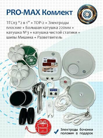 PRO-MAX комплект: (ТГСп-3, Тор-2, катушка №3 чистая статика, шипы Мишина, большая 220мм, разветвитель сигнала, электроды плоские и в подарок вы получите электроды бочонки): сравнение цен, характеристики, фото, актуальное наличие и цены.