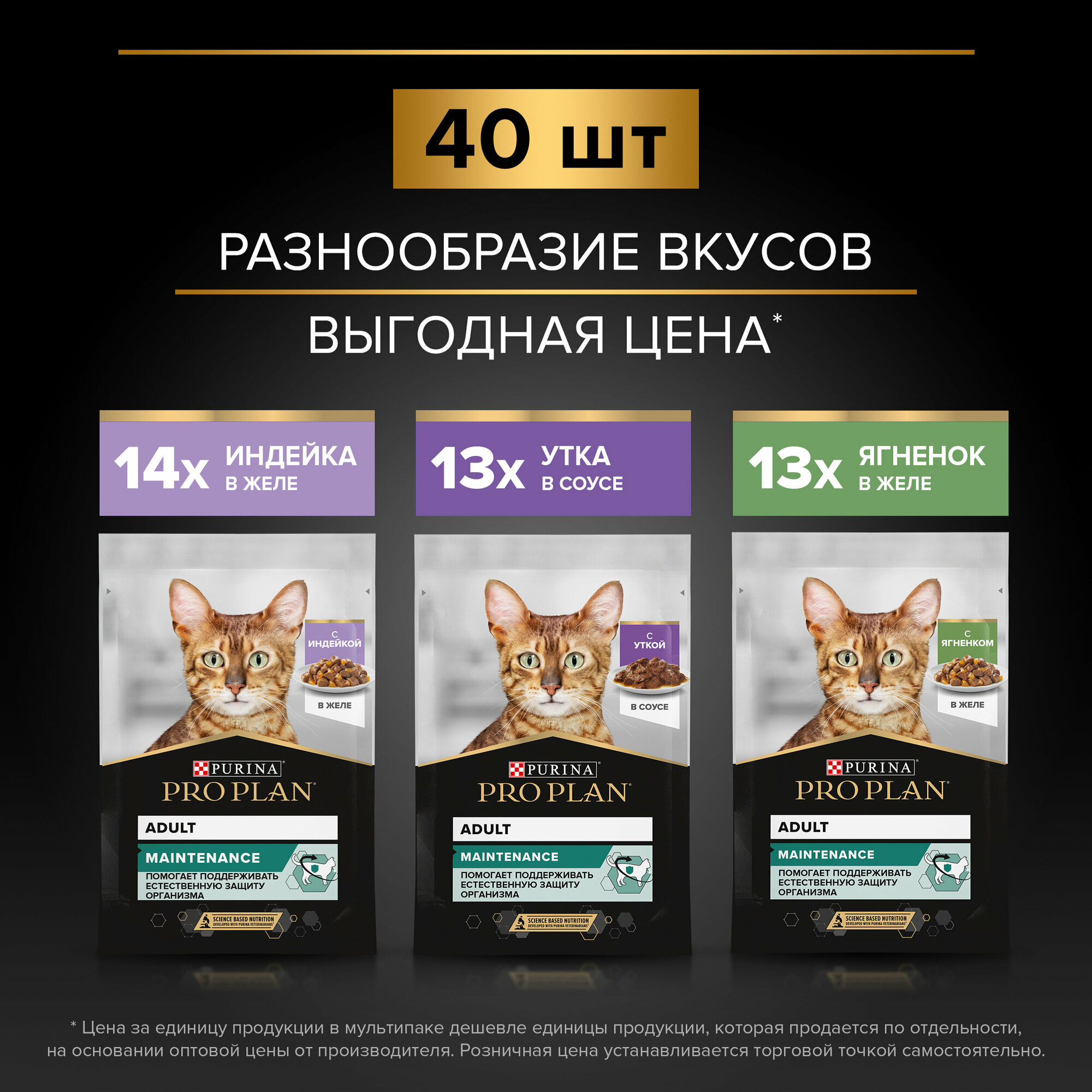 Купить Влажный корм PRO PLAN® MAINTENANCE для взрослых кошек с индейкой в желе, с уткой в соусе, с ягненком в желе 85 г х 40 шт с доставкой по всей России. Влажный корм PRO PLAN® MAINTENANCE для взрослых кошек с индейкой в желе, с уткой в соусе, с ягненком в желе 85 г х 40 шт: сравнение цен, характеристики, фото, актуальное наличие и цены.