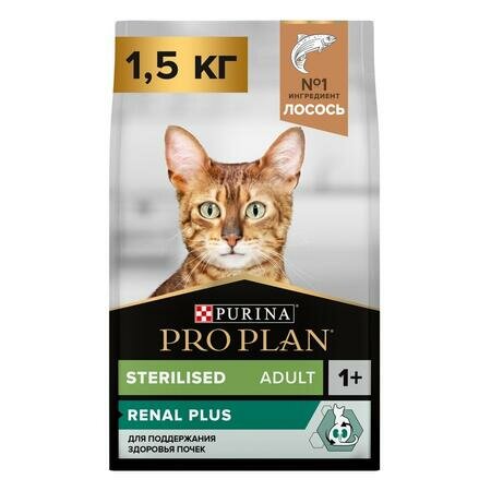 Pro Plan Sterilised RENAL PLUS 2 шт по 1,5 кг cухой корм для взрослых стерилизованных кошек для поддержания здоровья почек с лососем: сравнение цен, характеристики, фото, актуальное наличие и цены.