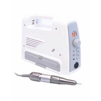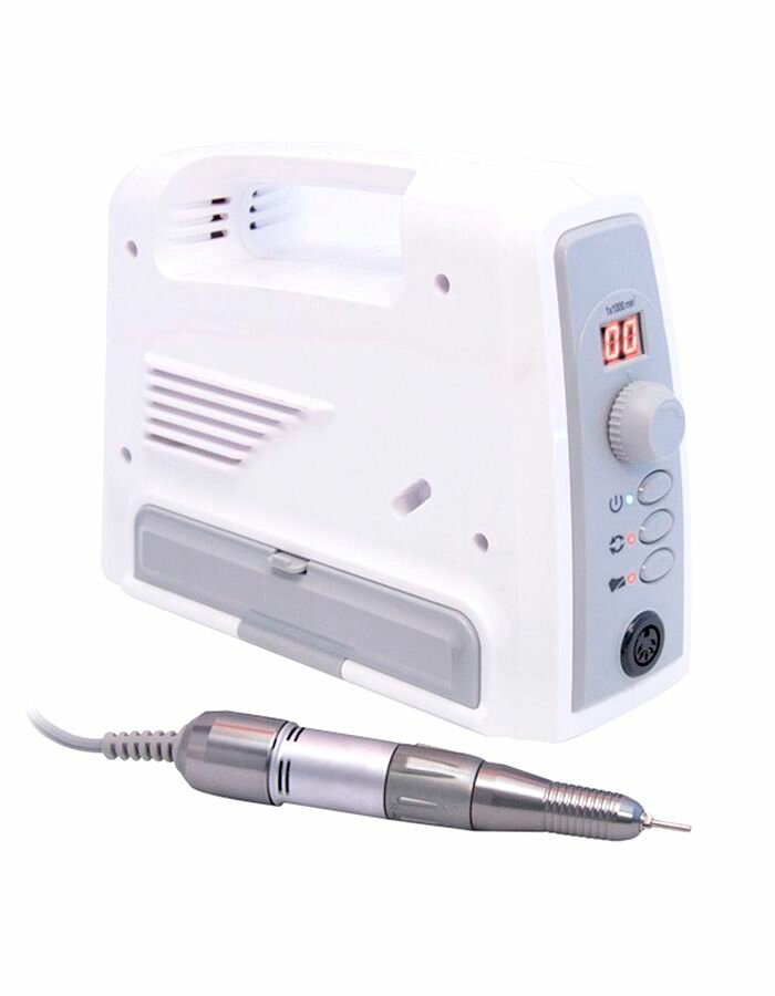 Аппарат для маникюра и снятия мягких материалов: вес ручки 210 г, длина 140 мм, мощность 45 Вт, общий вес 2,1 кг, педаль, плавная регулировка скорости вращения фрезы, размер 90x220x170 мм, реверс, питание 220 В, цанговый зажим, цифровой дисплей, частота вращения 30 000 об/мин.